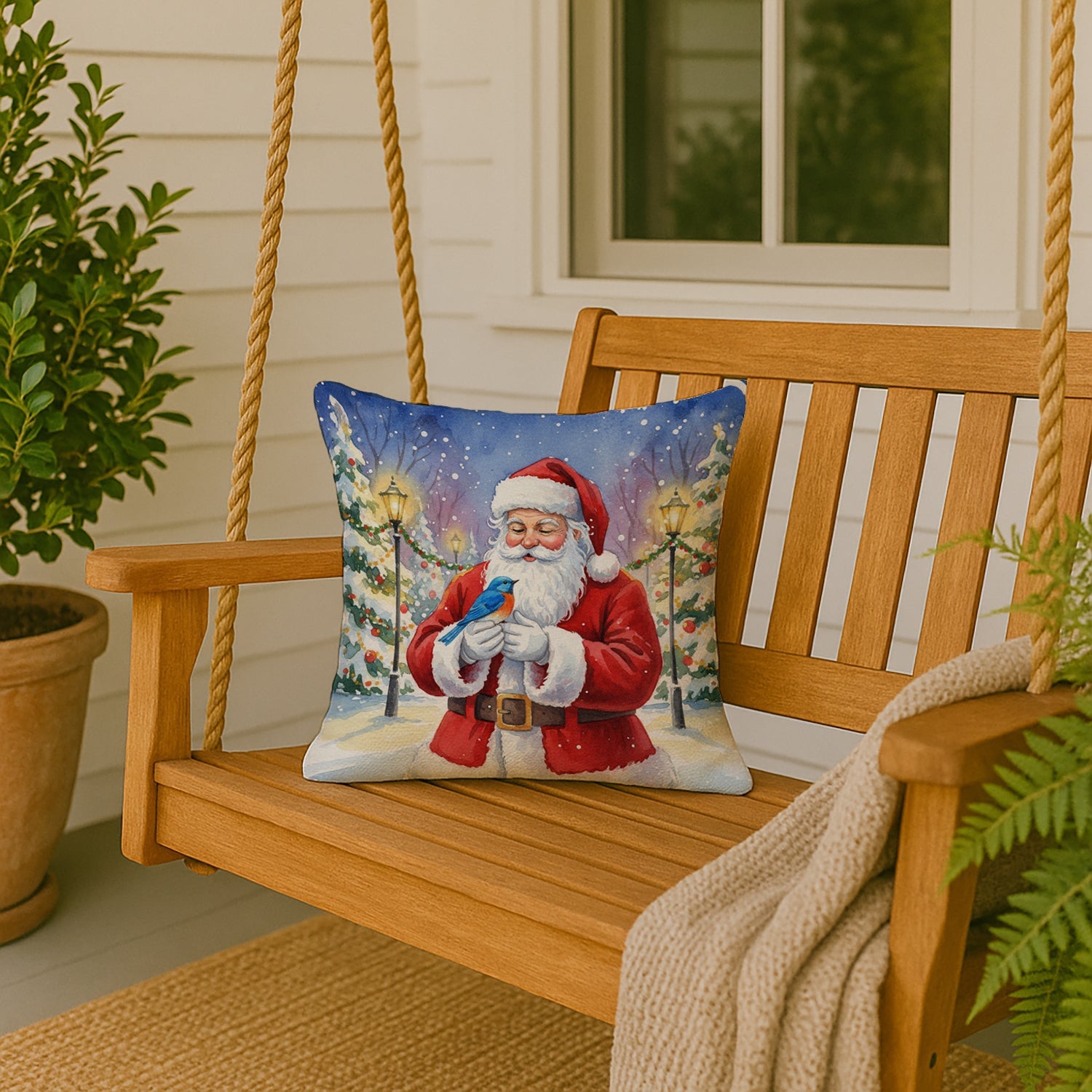 Throw Pillow featuring breed specific Bluebird artwork. Celebrate Christmas with this Christmas Pillow. Revitalize your outdoor or indoor living space with Caroline's Treasures 18x18 Fabric Decorative Pillow. With a generously sized dimension of approximately 18 inches by 18 inches, this pillow makes a comfortable and aesthetic addition to any seating area. Made from a unique, water-resistant material developed by Caroline's Treasures, the pillow sham is 100% polyester fabric that's durable and ready to weather any condition. Its vibrant, full-color artwork will not fade over time as it is dyed with color-fast dyes. Whether you place it on your patio furniture, porch, veranda, or indoor couch, its soft canvas fabric ensures a cozy experience. The pillow is handcrafted in the United States, featuring a sham created from three pieces of fabric and a polyester insert for enduring shape and overstuffed comfort. Despite being robustly built to endure the outdoors, it is as soft and snug as your favorite indoor cushions. Please note, as all our pillows are handmade, sizes may vary slightly, adding to the charm of this unique decorative item.