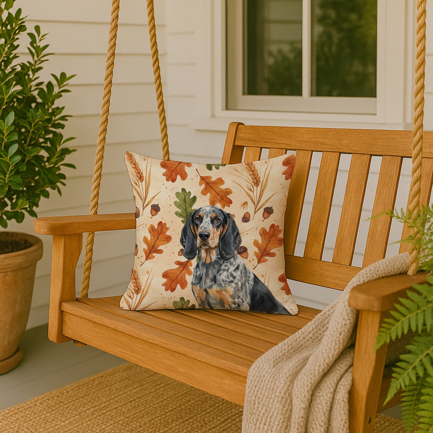 Throw Pillow featuring breed specific Bluetick Coonhound artwork. Celebrate Thanksgiving with this Thanksgiving Pillow. Revitalize your outdoor or indoor living space with Caroline's Treasures 18x18 Fabric Decorative Pillow. With a generously sized dimension of approximately 18 inches by 18 inches, this pillow makes a comfortable and aesthetic addition to any seating area. Made from a unique, water-resistant material developed by Caroline's Treasures, the pillow sham is 100% polyester fabric that's durable and ready to weather any condition. Its vibrant, full-color artwork will not fade over time as it is dyed with color-fast dyes. Whether you place it on your patio furniture, porch, veranda, or indoor couch, its soft canvas fabric ensures a cozy experience. The pillow is handcrafted in the United States, featuring a sham created from three pieces of fabric and a polyester insert for enduring shape and overstuffed comfort. Despite being robustly built to endure the outdoors, it is as soft and snug as your favorite indoor cushions. Please note, as all our pillows are handmade, sizes may vary slightly, adding to the charm of this unique decorative item.