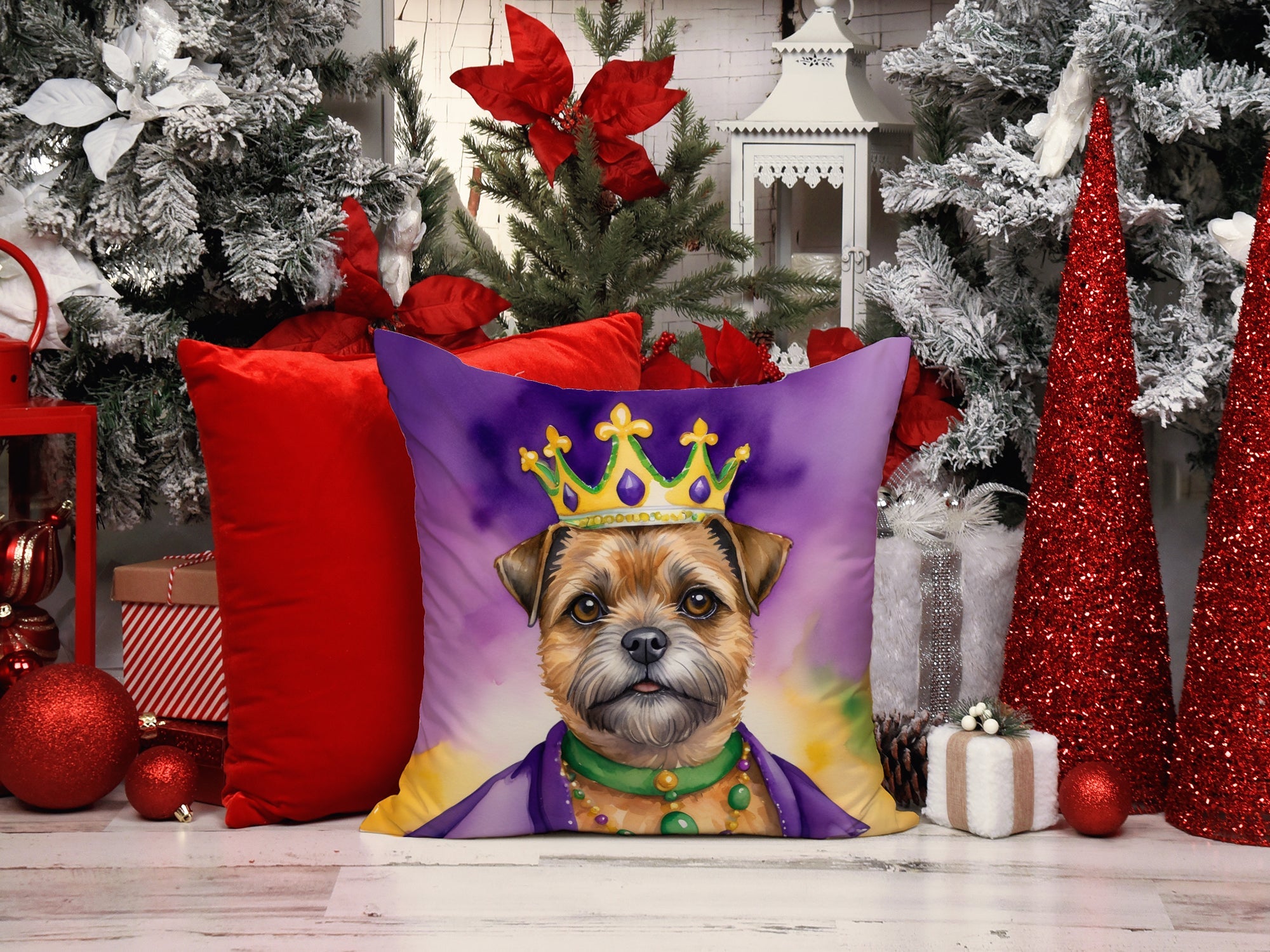 Throw Pillow featuring breed specific Border Terrier artwork. Celebrate Mardi Gras with this Mardi Gras Pillow. Add a touch of vibrancy and comfort to your outdoor seating with Caroline's Treasures Fabric Decorative Pillow. Measuring approximately 14 inches by 14 inches, this outdoor pillow is crafted to elevate the appeal of your patio furniture, infusing it with vivid color and artistic flair. The pillow includes a 100% Polyester Fabric sham filled with a quality pillow form to provide superior comfort. Innovatively made from our brand new material, specifically woven for its water resistance, this pillow is designed for durability. The soft canvas fabric offers versatility in use, fit for your indoor couch or your outdoor patio, porch, or veranda. The fabric is dyed with colorfast dyes built for resilience against weather conditions, ensuring the pillow retains its beauty over time. Constructed by sewing three fabric pieces to create a sham, the polyester insert is then nestled inside to form the pillow, resulting in an overstuffed pillow that maintains its shape. Both the sham and the pillow insert are proudly made in the United States. As the pillows are handcrafted, there may be minor variations in size, further enhancing their unique charm. Experience comfort in style with Caroline's Treasures Fabric Decorative Pillow.