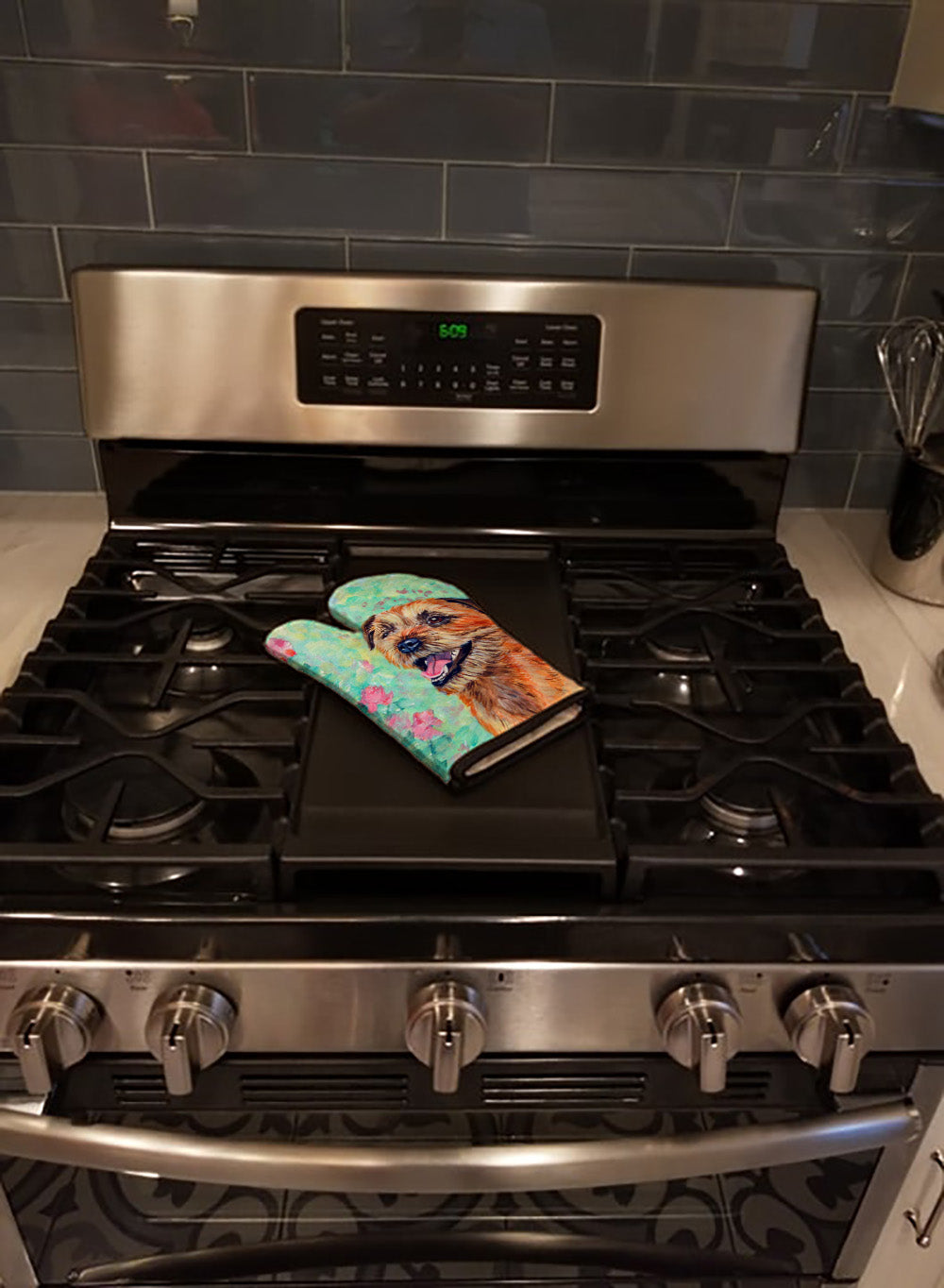 Decorate your space with our Border Terrier artwork on a Oven Mitt. Presenting our Large Right Hand Thick Heat Resistant Oven Mitt, an indispensable tool for any culinary enthusiast. This mitt boasts layers of quilted protection on both sides, providing outstanding resistance against extreme heat. Embellished with beautifully printed artwork, it adds an extra dash of charm to your kitchen decor. At about 12 inches long and 8 1/2 inches wide, this oven mitt offers a generous fit, accommodating a diverse range of hand sizes. Its design is enhanced by a sleek Black bias tape trim, finished with a convenient hoop for easy hanging. Fresh out of the packaging, the quilting process may give the mitt a stiff feel, but rest assured, it will soften with use and washing. Our mitt is crafted with a unique center fabric, Insul-Bright, a composite material made from polyester fibers, needle-punched through a nonwoven substrate and a reflective metallized film. This smart material resists both conduction and radiant energy, reflecting heat back to its source, all while remaining breathable. Our oven mitt is machine washable and safe for tumble drying. It's a perfect gift for your favorite Chef, BBQ enthusiast, or just a little treat for yourself! Experience safety, style, and convenience rolled into one with this exceptional oven mitt.