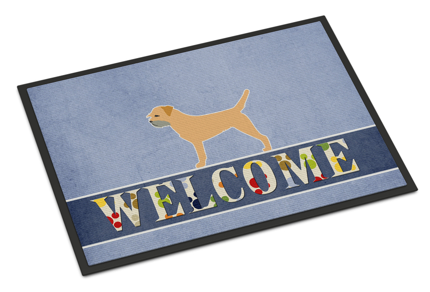 Decorate your space with our Border Terrier artwork on a Doormat. Welcome your guests in style with our Artwork Door Mat, designed to withstand almost any weather condition. This mat, measuring approximately 18 by 27 inches, is held together by durable black binding tape. Its top layer, composed of polyester felt, is dyed with the eye-catching image you see on the mat. A few layers below provide the mat with stability, while its rubber bottom is stamped to help prevent slipping and ensures safety. Our mat works wonderfully as both an indoor or outdoor door mat. For cleaning, simply hose it off with water or use a power washer - no need for any cleaner that produces suds. Avoid scrubbing with a brush, instead, opt for the vacuum on floor setting. Designed manufactured and printed in the USA, this mat is a perfect addition to your porch, outdoor kitchen, entryway, or any indoor space. Its unique design makes it a charming decorative rug that greets your guests and adds a stylish touch to your home decor.