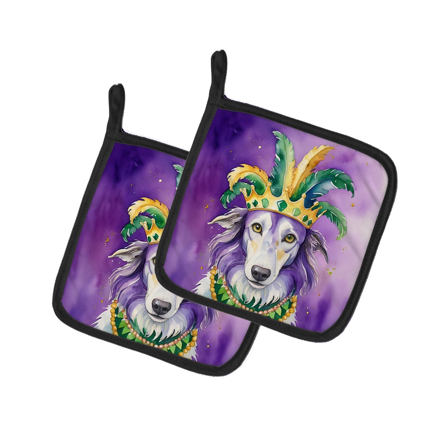 Pair of Pot Holders featuring breed specific Borzoi Russian Wolfhound artwork. Celebrate Mardi Gras with this Mardi Gras Pair of Pot Holders. A Pair of Pot Holders to match your kitchen decor. Made in the USA these are thick and functional. Full color artwork decorates the front polyester fabric of the hot pad and accented by a black trim. Use these at as a trivet for your Thanksgiving or Christmas tablescape. Filled with insulated fabric and quilted for durability. These colorful pot holders will make a great gift for your favorite home cook or executive chef. Each pot holder measures approximately 7 1/2 inches by 7 1/2 inches. A hanging tab is included.