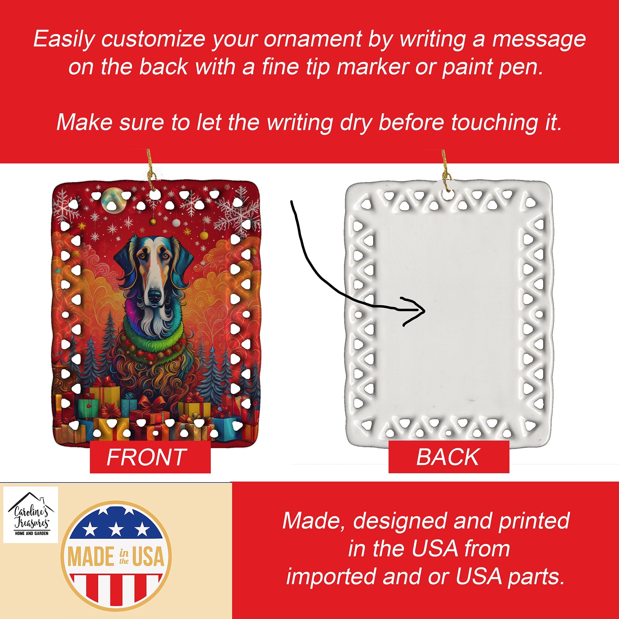 Porcelain Ornament featuring breed specific Borzoi Russian Wolfhound artwork. Celebrate Christmas with this Christmas Ornament. Add a unique, personal touch to your holiday decor with our Rectangular Lattice Porcelain Ornament. Perfect for creating cherished memories, this high-quality ornament shines under festive lights, reflecting warmth and joy throughout your Christmas tree. Crafted with a glossy finish, it showcases vibrant, full-color artwork contributed by our talented artists, ensuring your tree is adorned with a burst of color and holiday spirit. What sets this Porcelain Ornament apart is its customizable white back. Use a paint pen or permanent marker to write a heartfelt message, commemorate a special year, or mark an unforgettable date, turning this ornament into a keepsake that will be treasured for years to come. For best results, allow any personalization to dry thoroughly before handling. Each ornament comes complete with a delicate gold cord, making it easy to hang and display. Proudly made in the USA, this ornament measures 3.375 x 2.625 inches and is a thoughtful gift for pet sitters, teachers, family members, or anyone who would appreciate a little extra holiday magic. Bring style, charm, and a touch of personal meaning to your Christmas tree with this beautifully designed ornament..