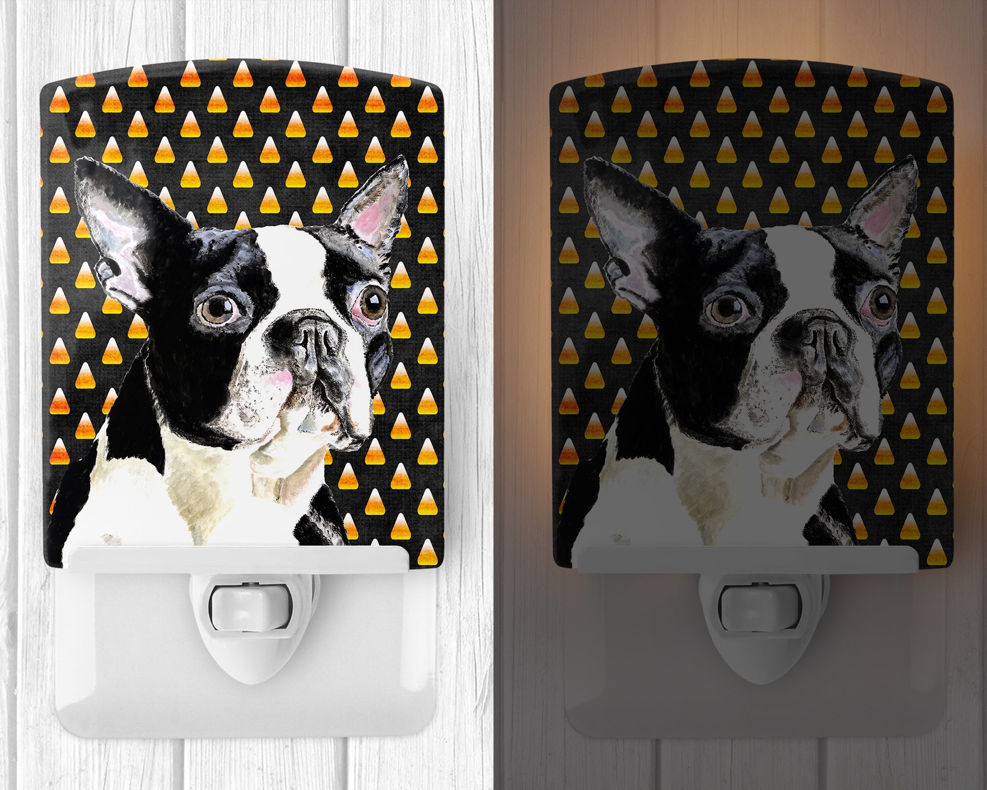 Decorate your space with our Halloween Boston Terrier artwork on a Night Light. Introduce a splash of artistic flair and subtle illumination to your space with the Decorative Ceramic Night Light from Caroline's Treasures. Perfect for any room, this night light seamlessly blends functionality with an aesthetic appeal, offering a stylish solution to brighten up dark corners of your home or office. Boasting a six-inch high by four-inch wide ceramic tile at the front, it showcases vivid, full-color artwork from distinguished artists, transforming a simple utility into a vibrant art piece. The artwork is securely encased in a robust metal holder, ensuring durability and longevity. Two screws are provided to firmly affix the tile into the holder. The holder extends three inches deep, housing an included bulb that emits a soft, welcoming glow. This product meets all safety standards, as evidenced by its UL approval. Proudly made in the United States from imported components, this Decorative Ceramic Night Light is not just a functional device; it's a statement piece that enhances the ambiance of your surroundings.