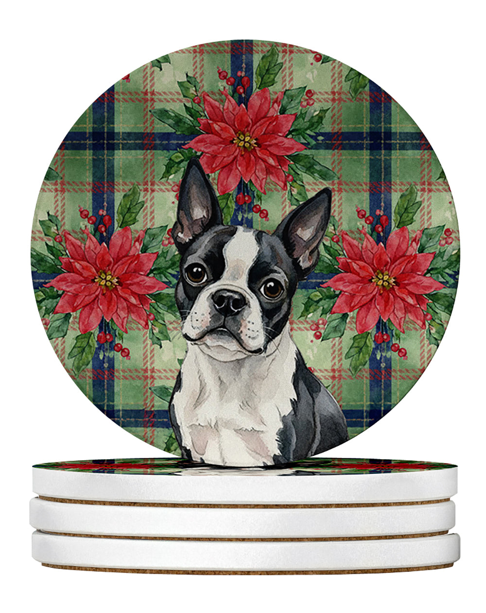 Large Sandstone Coasters Pack of 4 featuring breed specific Boston Terrier artwork. Celebrate Christmas with this Christmas Sandstone Coasters Pack of 4. Introducing Caroline's Treasures Large Sandstone Coasters Pack of 4, the perfect addition to your home decor. Each coaster measures nearly 4 inches and is made from absorbent sandstone with a cork backing. Designed and printed in the United States, these coasters feature artwork from Caroline's Treasures' talented artists. Protect your countertops and tables from hot and cold drink condensation with these absorbent coasters. They efficiently absorb moisture, ensuring your surfaces stay dry and clean. Choose from a wide range of designs to update and enhance your decor or give them as a thoughtful gift for any occasion. Cleaning is a breeze�simply wipe the coaster with a damp towel to remove any spills or stains. Each set comes in a brown gift box, making it ready to be wrapped for that special person in your life. These absorbent sandstone coasters also make an excellent housewarming gift, providing both practicality and style. Celebrate birthdays, Mother's Day, Father's Day, Thanksgiving, Christmas, Teacher's Appreciation Day, or simply show someone you care with these versatile and charming coasters. Caroline's Treasures Large Sandstone Coasters Pack of 4 is the perfect happy gift for any occasion.