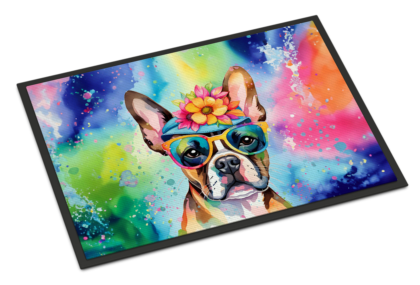 Decorate your space with our Boston Terrier artwork on a Doormat. Bring a bit of Summer into your home with a Summer Doormat. Welcome your guests in style with our Artwork Door Mat, designed to withstand almost any weather condition. This mat, measuring approximately 24 by 36 inches, is held together by durable black binding tape. Its top layer, composed of polyester felt, is dyed with the eye-catching image you see on the mat. A few layers below provide the mat with stability, while its rubber bottom is stamped to help prevent slipping and ensures safety. Our mat works wonderfully as both an indoor or outdoor door mat. For cleaning, simply hose it off with water or use a power washer - no need for any cleaner that produces suds. Avoid scrubbing with a brush, instead, opt for the vacuum on floor setting. Designed manufactured and printed in the USA, this mat is a perfect addition to your porch, outdoor kitchen, entryway, or any indoor space. Its unique design makes it a charming decorative rug that greets your guests and adds a stylish touch to your home decor.