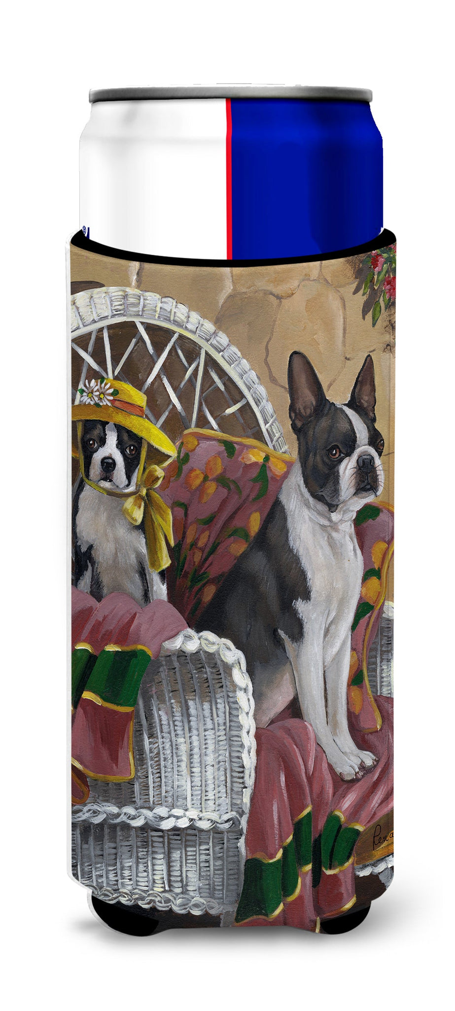 Decorate your space with our Boston Terrier artwork on a Slim Can Hugger. Elevate your beverage experience with our Slim Can Huggers, uniquely designed to fit a variety of your favorite 12 oz slim cans. Perfectly suited for Michelob Ultra, Starbucks Refreshers, Heineken Light, Bud Lite Lime, Dry Soda, Coors, Resin, Vitaminwater Energy, and Perrier Cans, our huggers ensure your drink stays refreshingly cool. The feature that sets our can huggers apart is the striking full-color artwork, exclusively created by one of our talented artists. It adds a touch of individuality and style to your drink, making it easier to identify in a crowd. A unique blend of practicality and flair, these huggers are an absolute must-have at any gathering. Our can huggers are not just beautiful but also incredibly durable. The design won't fade or peel off, and they can be safely cleaned in a washing machine. These collapsible beverage insulators are easy to store and transport, making them perfect for all occasions. Enjoy your drinks in style and comfort with our exceptional Slim Can Huggers.