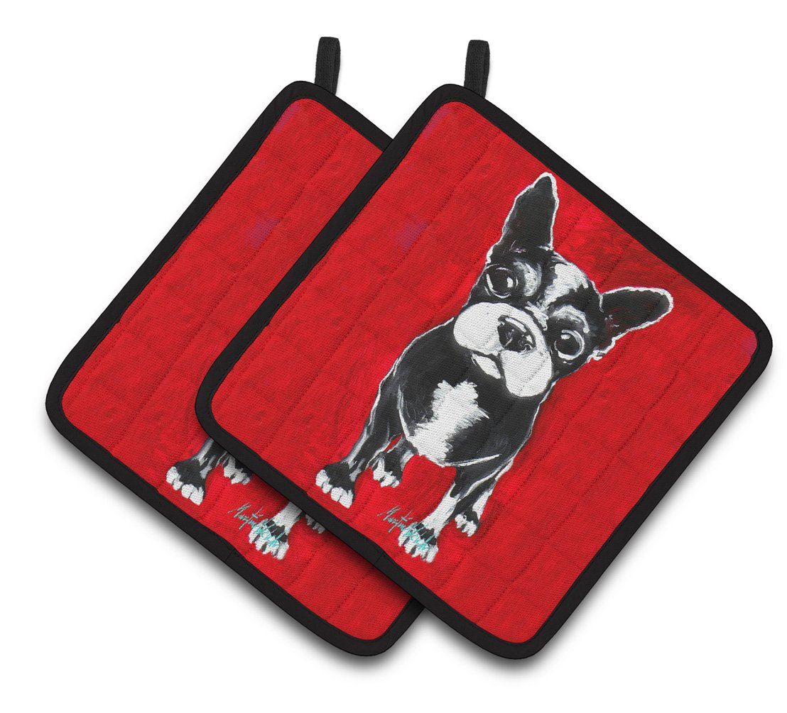 Decorate your space with our Boston Terrier artwork on a Pair of Pot Holders. A Pair of Pot Holders to match your kitchen decor. Made in the USA these are thick and functional. Full color artwork decorates the front polyester fabric of the hot pad and accented by a black trim. Use these at as a trivet for your Thanksgiving or Christmas tablescape. Filled with insulated fabric and quilted for durability. These colorful pot holders will make a great gift for your favorite home cook or executive chef. Each pot holder measures approximately 7 1/2 inches by 7 1/2 inches. A hanging tab is included.