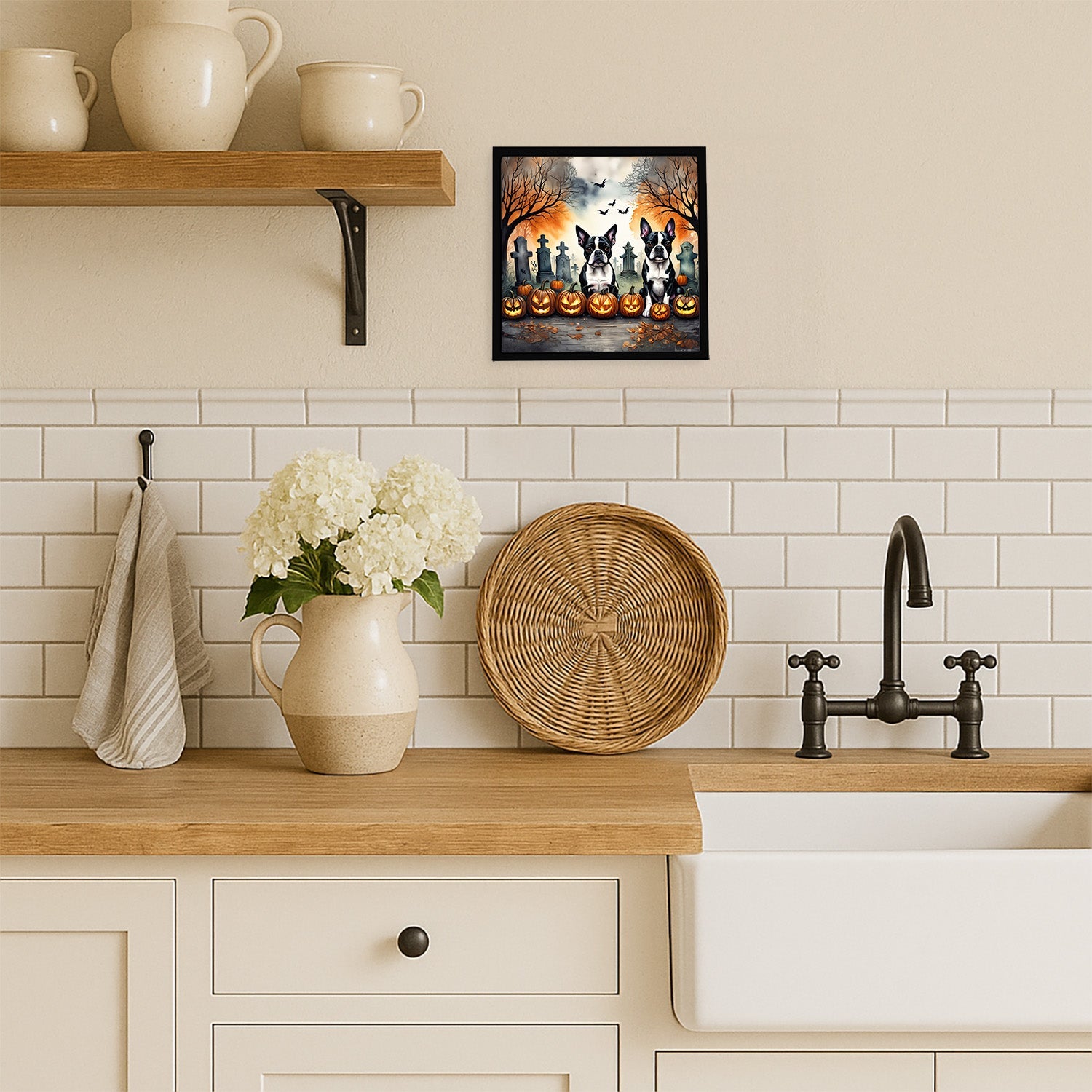 Framed Metal Print featuring breed specific Boston Terrier artwork. Celebrate Halloween with this Halloween Framed Metal Print. Looking for wall art that’s stylish, safe, and made to last? Our 8x8 Framed Metal Prints are designed with modern living in mind. Each piece features original artwork printed on durable aluminum, set in a sleek frame that measures 3/4 inch deep for a clean, contemporary finish. Unlike glass prints, these are lightweight, shatter-free, and family-safe. Perfect for kitchens, bathrooms, or covered porches where traditional décor might not hold up. The built-in sawtooth hanger molded into the back makes it easy to hang right out of the box—just use your own nails or screws. Cleaning is simple too: a quick wipe with a damp cloth and mild soap keeps your artwork looking vibrant. Proudly made in Alabama, every print supports our community of artists while adding personality and charm to your home.