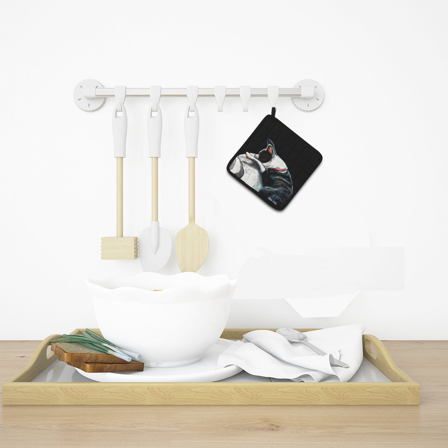 Decorate your space with our Boston Terrier artwork on a Pair of Pot Holders. A Pair of Pot Holders to match your kitchen decor. Made in the USA these are thick and functional. Full color artwork decorates the front polyester fabric of the hot pad and accented by a black trim. Use these at as a trivet for your Thanksgiving or Christmas tablescape. Filled with insulated fabric and quilted for durability. These colorful pot holders will make a great gift for your favorite home cook or executive chef. Each pot holder measures approximately 7 1/2 inches by 7 1/2 inches. A hanging tab is included.
