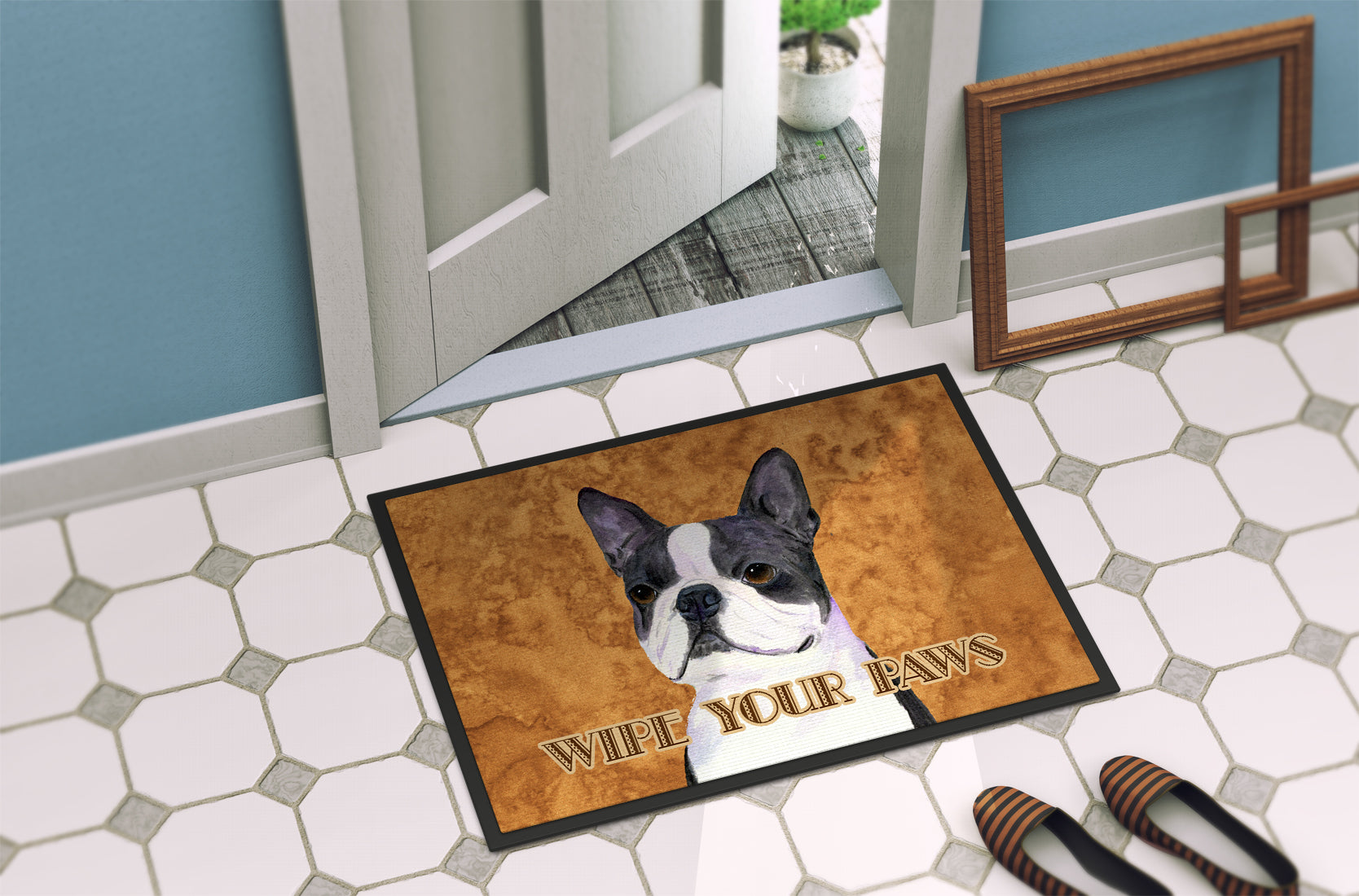 Decorate your space with our Boston Terrier artwork on a Doormat. Welcome your guests in style with our Artwork Door Mat, designed to withstand almost any weather condition. This mat, measuring approximately 24 by 36 inches, is held together by durable black binding tape. Its top layer, composed of polyester felt, is dyed with the eye-catching image you see on the mat. A few layers below provide the mat with stability, while its rubber bottom is stamped to help prevent slipping and ensures safety. Our mat works wonderfully as both an indoor or outdoor door mat. For cleaning, simply hose it off with water or use a power washer - no need for any cleaner that produces suds. Avoid scrubbing with a brush, instead, opt for the vacuum on floor setting. Designed manufactured and printed in the USA, this mat is a perfect addition to your porch, outdoor kitchen, entryway, or any indoor space. Its unique design makes it a charming decorative rug that greets your guests and adds a stylish touch to your home decor.