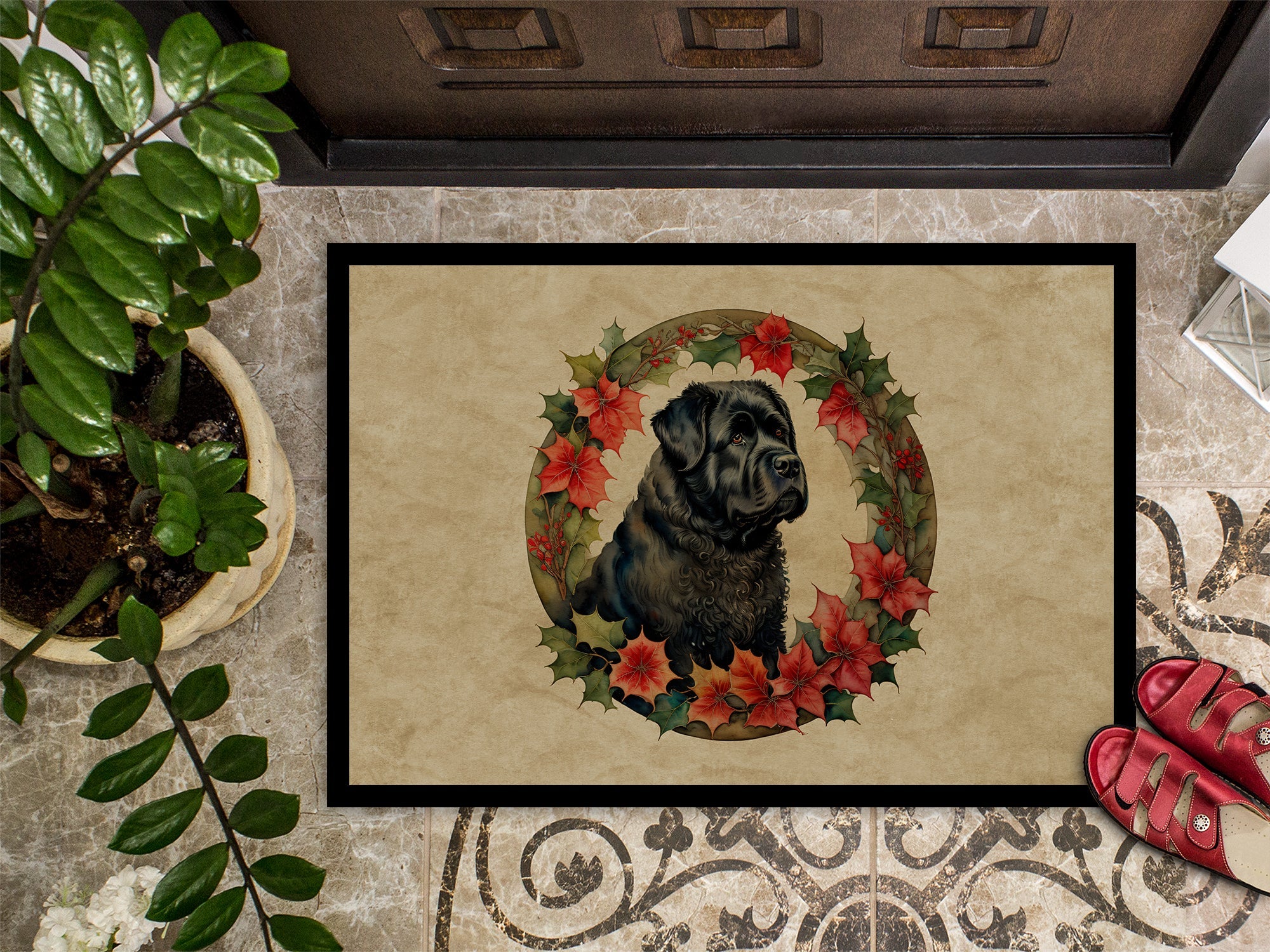 Decorate your space with our Christmas Bouvier des Flandres artwork on a Doormat. Bring a bit of Winter into your home with a Winter Doormat. Welcome your guests in style with our Artwork Door Mat, designed to withstand almost any weather condition. This mat, measuring approximately 24 by 36 inches, is held together by durable black binding tape. Its top layer, composed of polyester felt, is dyed with the eye-catching image you see on the mat. A few layers below provide the mat with stability, while its rubber bottom is stamped to help prevent slipping and ensures safety. Our mat works wonderfully as both an indoor or outdoor door mat. For cleaning, simply hose it off with water or use a power washer - no need for any cleaner that produces suds. Avoid scrubbing with a brush, instead, opt for the vacuum on floor setting. Designed manufactured and printed in the USA, this mat is a perfect addition to your porch, outdoor kitchen, entryway, or any indoor space. Its unique design makes it a charming decorative rug that greets your guests and adds a stylish touch to your home decor.