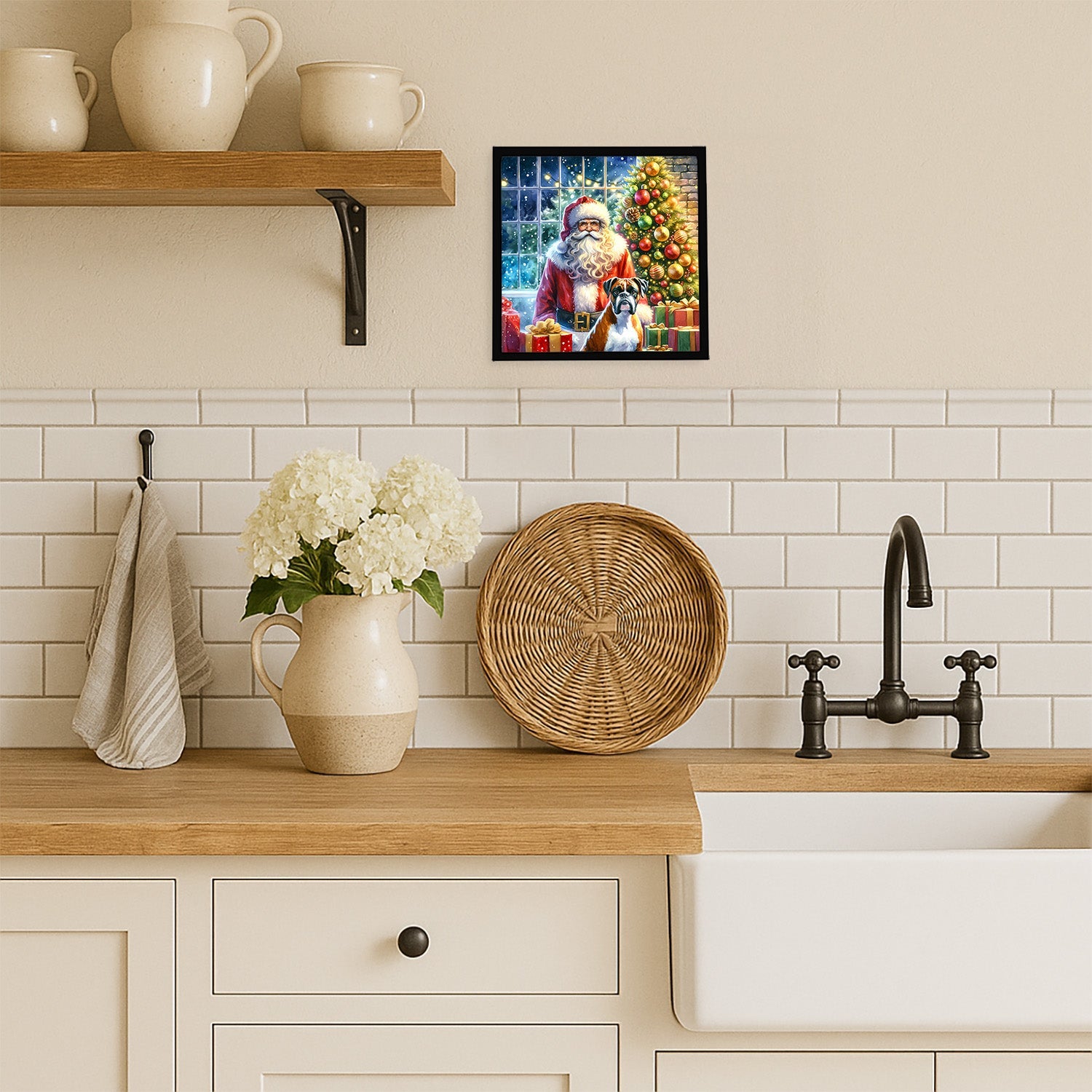Framed Metal Print featuring breed specific Boxer artwork. Celebrate Christmas with this Christmas Framed Metal Print. Looking for wall art that’s stylish, safe, and made to last? Our 8x8 Framed Metal Prints are designed with modern living in mind. Each piece features original artwork printed on durable aluminum, set in a sleek frame that measures 3/4 inch deep for a clean, contemporary finish. Unlike glass prints, these are lightweight, shatter-free, and family-safe. Perfect for kitchens, bathrooms, or covered porches where traditional décor might not hold up. The built-in sawtooth hanger molded into the back makes it easy to hang right out of the box—just use your own nails or screws. Cleaning is simple too: a quick wipe with a damp cloth and mild soap keeps your artwork looking vibrant. Proudly made in Alabama, every print supports our community of artists while adding personality and charm to your home.