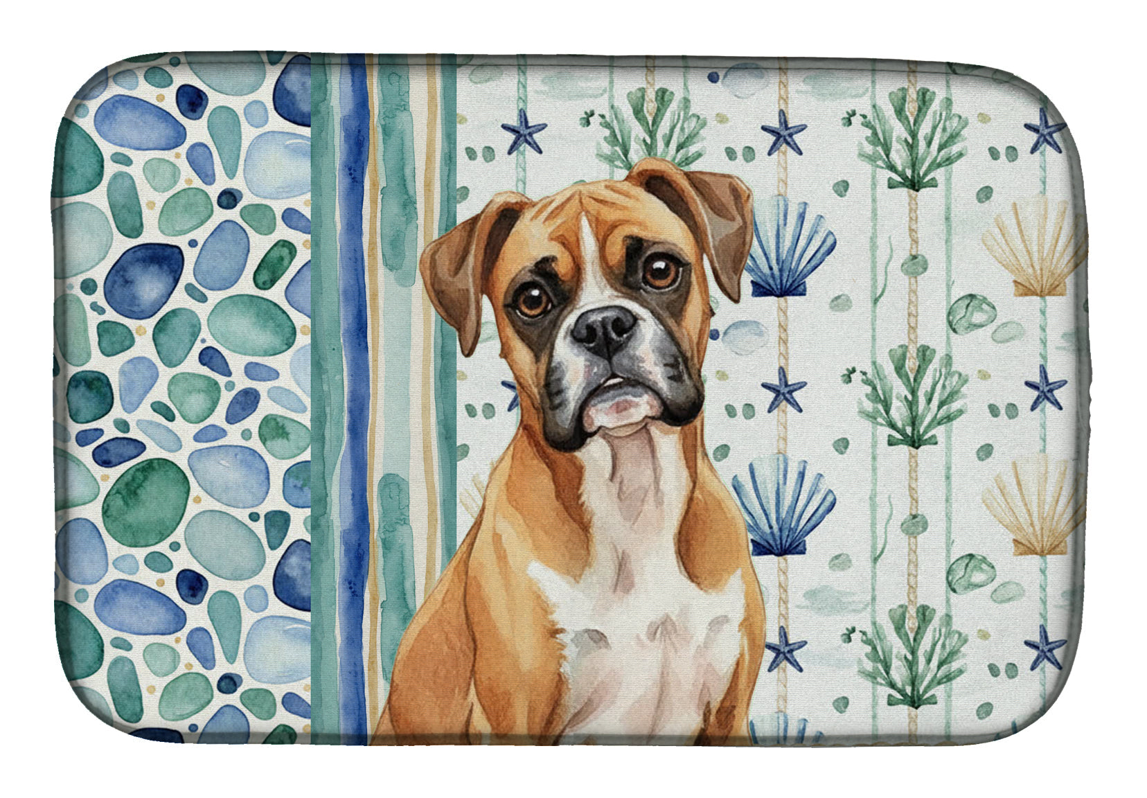 Shown here is the Boxer Coastal Sea Glass Dish Drying Mat from Caroline's Treasures featuring artwork of a Boxer in a Everyday design. The detailed illustration and vibrant colors make it a standout accent that celebrates both seasonal style and love for the subject. This image features a calming coastal watercolor pattern with soft seashells, seaweed, starfish, and pebble-inspired accents arranged in a repeating design. The soothing palette of blues, greens, and sandy neutrals creates a relaxed, beach-inspired look that adds a fresh and tranquil feel to any space. Everyday décor celebrates personal style and the small moments that make a house feel like home. Thoughtful designs add warmth and personality that can be enjoyed year-round. Say goodbye to messy countertops and soggy dish towels with our innovative dish drying mat. Our high-quality dish drying pad is designed to keep your countertops dry while offering a stylish and efficient solution. Whether you're air drying dishes, glasses, stemware, silverware, pots, pans, bottles, or even fruits and vegetables, our dish mat is the perfect choice. The 14 inches x 21 inches size fits most counters and dish drying racks, and the non-slip design ensures stability. Made with water-absorbent polyester and a polyurethane foam insert, our dish drying mat is not only functional but also durable. It's machine washable and printed in the USA for long-lasting use. The beautiful artwork adds flair to your kitchen decor, making it a perfect housewarming gift or present for any occasion. Upgrade your kitchen experience with our absorbent and versatile dish drying mat. Perfect for: Kitchen counters and sinks, everyday dish drying and countertop protection, Dogs-themed homes, or year-round use for Boxer lovers. Boxers are energetic, playful dogs known for their strength and affectionate nature. This popular breed is loved for its loyalty, enthusiasm, and strong bond with families. Makes a heartfelt gift for: Boxer owners, Dogs lovers, Everyday gifts, pet parents, friends who adore their Boxer, or anyone celebrating Dogs.