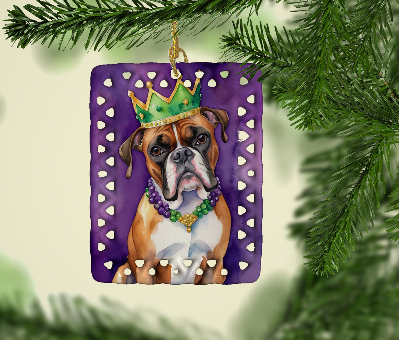 Porcelain Ornament featuring breed specific Boxer artwork. Celebrate Mardi Gras with this Mardi Gras Ornament. Add a unique, personal touch to your holiday decor with our Rectangular Lattice Porcelain Ornament. Perfect for creating cherished memories, this high-quality ornament shines under festive lights, reflecting warmth and joy throughout your Christmas tree. Crafted with a glossy finish, it showcases vibrant, full-color artwork contributed by our talented artists, ensuring your tree is adorned with a burst of color and holiday spirit. What sets this Porcelain Ornament apart is its customizable white back. Use a paint pen or permanent marker to write a heartfelt message, commemorate a special year, or mark an unforgettable date, turning this ornament into a keepsake that will be treasured for years to come. For best results, allow any personalization to dry thoroughly before handling. Each ornament comes complete with a delicate gold cord, making it easy to hang and display. Proudly made in the USA, this ornament measures 3.375 x 2.625 inches and is a thoughtful gift for pet sitters, teachers, family members, or anyone who would appreciate a little extra holiday magic. Bring style, charm, and a touch of personal meaning to your Christmas tree with this beautifully designed ornament..