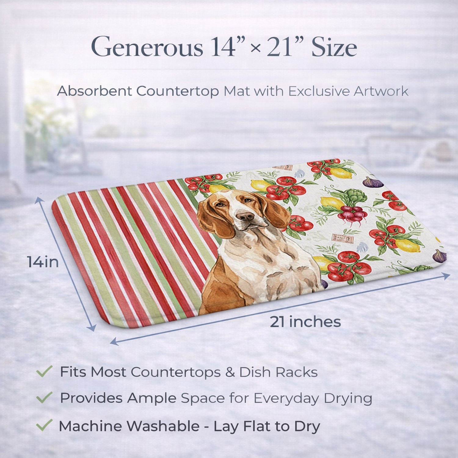 Shown here is the Bracco Italiano Vegetables Dish Drying Mat from Caroline's Treasures featuring artwork of a Bracco Italiano in a Everyday design. The detailed illustration and vibrant colors make it a standout accent that celebrates both seasonal style and love for the subject. This image features a vibrant watercolor vegetable pattern with tomatoes, lemons, artichokes, figs, radishes, and leafy greens arranged in a repeating design, paired with classic red and green stripes. The bright, garden-fresh palette creates a cheerful, farmhouse-inspired look that feels lively, welcoming, and perfect for kitchen décor. Everyday décor celebrates personal style and the small moments that make a house feel like home. Thoughtful designs add warmth and personality that can be enjoyed year-round. Say goodbye to messy countertops and soggy dish towels with our innovative dish drying mat. Our high-quality dish drying pad is designed to keep your countertops dry while offering a stylish and efficient solution. Whether you're air drying dishes, glasses, stemware, silverware, pots, pans, bottles, or even fruits and vegetables, our dish mat is the perfect choice. The 14 inches x 21 inches size fits most counters and dish drying racks, and the non-slip design ensures stability. Made with water-absorbent polyester and a polyurethane foam insert, our dish drying mat is not only functional but also durable. It's machine washable and printed in the USA for long-lasting use. The beautiful artwork adds flair to your kitchen decor, making it a perfect housewarming gift or present for any occasion. Upgrade your kitchen experience with our absorbent and versatile dish drying mat. Perfect for: Kitchen counters and sinks, everyday dish drying and countertop protection, Dogs-themed homes, or year-round use for Bracco Italiano lovers. Bracco Italianos are large sporting dogs with strong builds and expressive faces. Their look reflects endurance and versatility. Makes a heartfelt gift for: Bracco Italiano owners, Dogs lovers, Everyday gifts, pet parents, friends who adore their Bracco Italiano, or anyone celebrating Dogs.