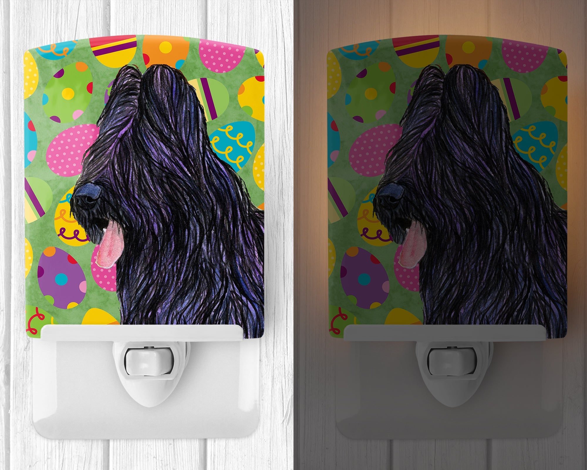 Decorate your space with our Easter Briard artwork on a Night Light. Introduce a splash of artistic flair and subtle illumination to your space with the Decorative Ceramic Night Light from Caroline's Treasures. Perfect for any room, this night light seamlessly blends functionality with an aesthetic appeal, offering a stylish solution to brighten up dark corners of your home or office. Boasting a six-inch high by four-inch wide ceramic tile at the front, it showcases vivid, full-color artwork from distinguished artists, transforming a simple utility into a vibrant art piece. The artwork is securely encased in a robust metal holder, ensuring durability and longevity. Two screws are provided to firmly affix the tile into the holder. The holder extends three inches deep, housing an included bulb that emits a soft, welcoming glow. This product meets all safety standards, as evidenced by its UL approval. Proudly made in the United States from imported components, this Decorative Ceramic Night Light is not just a functional device; it's a statement piece that enhances the ambiance of your surroundings.