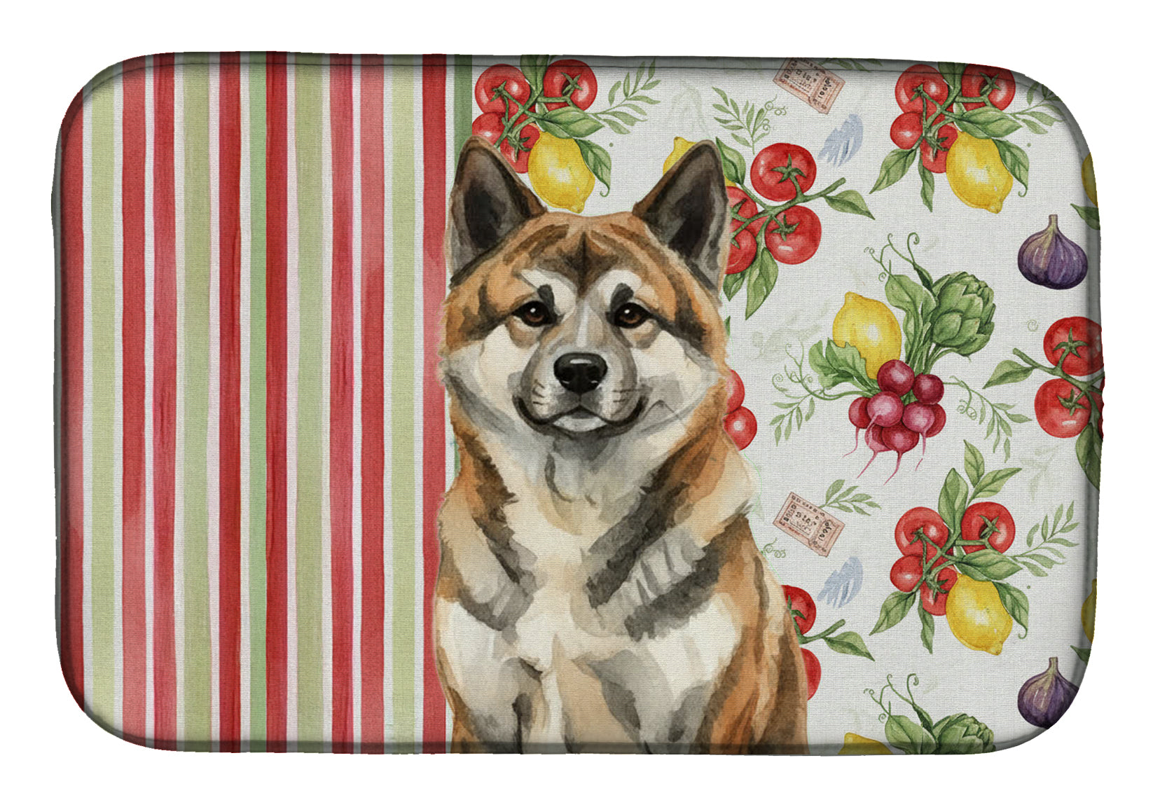 Shown here is the Brindle Akita Vegetables Dish Drying Mat from Caroline's Treasures featuring artwork of a Akita in a Everyday design. The detailed illustration and vibrant colors make it a standout accent that celebrates both seasonal style and love for the subject. This image features a vibrant watercolor vegetable pattern with tomatoes, lemons, artichokes, figs, radishes, and leafy greens arranged in a repeating design, paired with classic red and green stripes. The bright, garden-fresh palette creates a cheerful, farmhouse-inspired look that feels lively, welcoming, and perfect for kitchen décor. Everyday décor celebrates personal style and the small moments that make a house feel like home. Thoughtful designs add warmth and personality that can be enjoyed year-round. Say goodbye to messy countertops and soggy dish towels with our innovative dish drying mat. Our high-quality dish drying pad is designed to keep your countertops dry while offering a stylish and efficient solution. Whether you're air drying dishes, glasses, stemware, silverware, pots, pans, bottles, or even fruits and vegetables, our dish mat is the perfect choice. The 14 inches x 21 inches size fits most counters and dish drying racks, and the non-slip design ensures stability. Made with water-absorbent polyester and a polyurethane foam insert, our dish drying mat is not only functional but also durable. It's machine washable and printed in the USA for long-lasting use. The beautiful artwork adds flair to your kitchen decor, making it a perfect housewarming gift or present for any occasion. Upgrade your kitchen experience with our absorbent and versatile dish drying mat. Perfect for: Kitchen counters and sinks, everyday dish drying and countertop protection, Dogs-themed homes, or year-round use for Akita lovers. Akitas are powerful and dignified dogs known for their loyalty, strength, and calm confidence. Originating in Japan, this noble breed is deeply devoted to its family and respected for its protective instincts and quiet presence. Makes a heartfelt gift for: Akita owners, Dogs lovers, Everyday gifts, pet parents, friends who adore their Akita, or anyone celebrating Dogs.