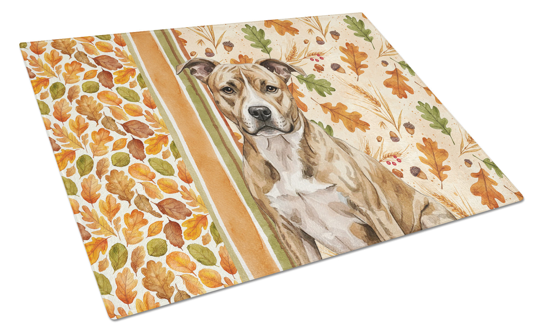 Glass Cutting Board featuring breed specific American Staffordshire Terrier artwork. Celebrate Thanksgiving with this Thanksgiving Cutting Board. Introduce your kitchen to the vibrant, large Decorative Glass Cutting Board from Caroline's Treasures. Crafted from resilient tempered glass, this board is not only a utilitarian necessity but also a colorful art piece. With its generous dimensions of 15 inches in height and 12 inches in length, it offers ample space for all your cutting needs. Every piece showcases captivating artwork from distinguished artists, bringing an aesthetic edge to your kitchen. Beyond its attractive design, this cutting board ensures your countertop stays pristine and unscathed, owing to its heat-resistant properties. Engineered with user convenience in mind, it features non-skid feet for stability, and rounded corners for additional safety. Its robust construction renders it virtually unbreakable, guaranteeing longevity. The board comes with protective feet bumpers, maintaining its position during use. This product is recommended to be hand washed only. Proudly printed and assembled in the United States, this cutting board exemplifies superior craftsmanship. With Caroline's Treasures' Decorative Glass Cutting Board, you're investing in a blend of functionality and artistic flair.