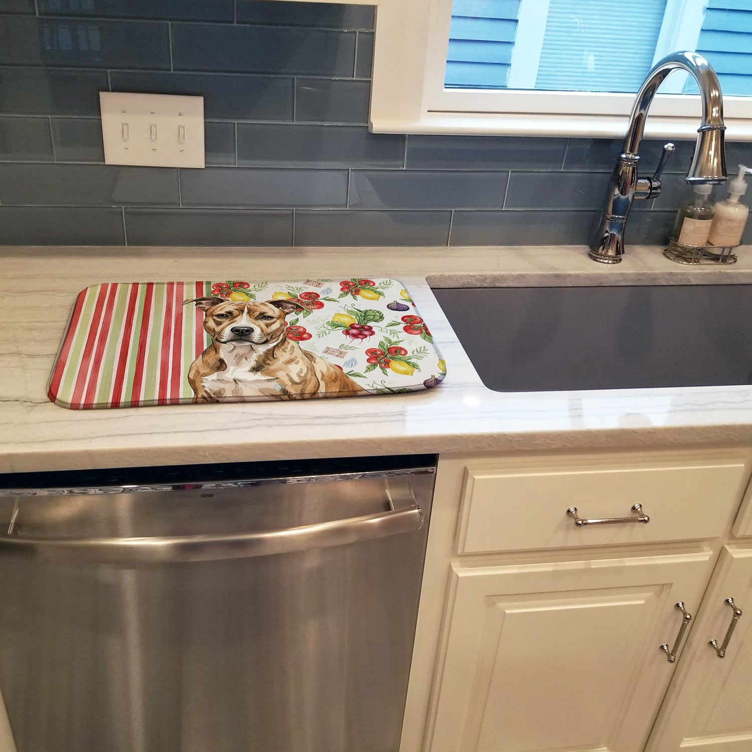 Shown here is the Brindle American Staffordshire Terrier Vegetables Dish Drying Mat from Caroline's Treasures featuring artwork of a American Staffordshire Terrier in a Everyday design. The detailed illustration and vibrant colors make it a standout accent that celebrates both seasonal style and love for the subject. This image features a vibrant watercolor vegetable pattern with tomatoes, lemons, artichokes, figs, radishes, and leafy greens arranged in a repeating design, paired with classic red and green stripes. The bright, garden-fresh palette creates a cheerful, farmhouse-inspired look that feels lively, welcoming, and perfect for kitchen décor. Everyday décor celebrates personal style and the small moments that make a house feel like home. Thoughtful designs add warmth and personality that can be enjoyed year-round. Say goodbye to messy countertops and soggy dish towels with our innovative dish drying mat. Our high-quality dish drying pad is designed to keep your countertops dry while offering a stylish and efficient solution. Whether you're air drying dishes, glasses, stemware, silverware, pots, pans, bottles, or even fruits and vegetables, our dish mat is the perfect choice. The 14 inches x 21 inches size fits most counters and dish drying racks, and the non-slip design ensures stability. Made with water-absorbent polyester and a polyurethane foam insert, our dish drying mat is not only functional but also durable. It's machine washable and printed in the USA for long-lasting use. The beautiful artwork adds flair to your kitchen decor, making it a perfect housewarming gift or present for any occasion. Upgrade your kitchen experience with our absorbent and versatile dish drying mat. Perfect for: Kitchen counters and sinks, everyday dish drying and countertop protection, Dogs-themed homes, or year-round use for American Staffordshire Terrier lovers. American Staffordshire Terriers are muscular dogs with confident posture. Their strong build reflects loyalty and courage. Makes a heartfelt gift for: American Staffordshire Terrier owners, Dogs lovers, Everyday gifts, pet parents, friends who adore their American Staffordshire Terrier, or anyone celebrating Dogs.