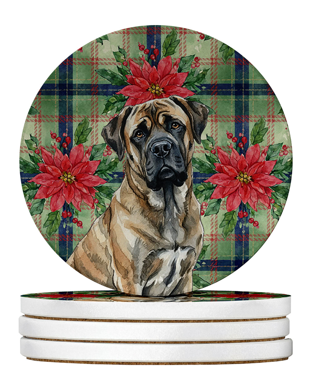 Large Sandstone Coasters Pack of 4 featuring breed specific Mastiff artwork. Celebrate Christmas with this Christmas Sandstone Coasters Pack of 4. Introducing Caroline's Treasures Large Sandstone Coasters Pack of 4, the perfect addition to your home decor. Each coaster measures nearly 4 inches and is made from absorbent sandstone with a cork backing. Designed and printed in the United States, these coasters feature artwork from Caroline's Treasures' talented artists. Protect your countertops and tables from hot and cold drink condensation with these absorbent coasters. They efficiently absorb moisture, ensuring your surfaces stay dry and clean. Choose from a wide range of designs to update and enhance your decor or give them as a thoughtful gift for any occasion. Cleaning is a breeze�simply wipe the coaster with a damp towel to remove any spills or stains. Each set comes in a brown gift box, making it ready to be wrapped for that special person in your life. These absorbent sandstone coasters also make an excellent housewarming gift, providing both practicality and style. Celebrate birthdays, Mother's Day, Father's Day, Thanksgiving, Christmas, Teacher's Appreciation Day, or simply show someone you care with these versatile and charming coasters. Caroline's Treasures Large Sandstone Coasters Pack of 4 is the perfect happy gift for any occasion.