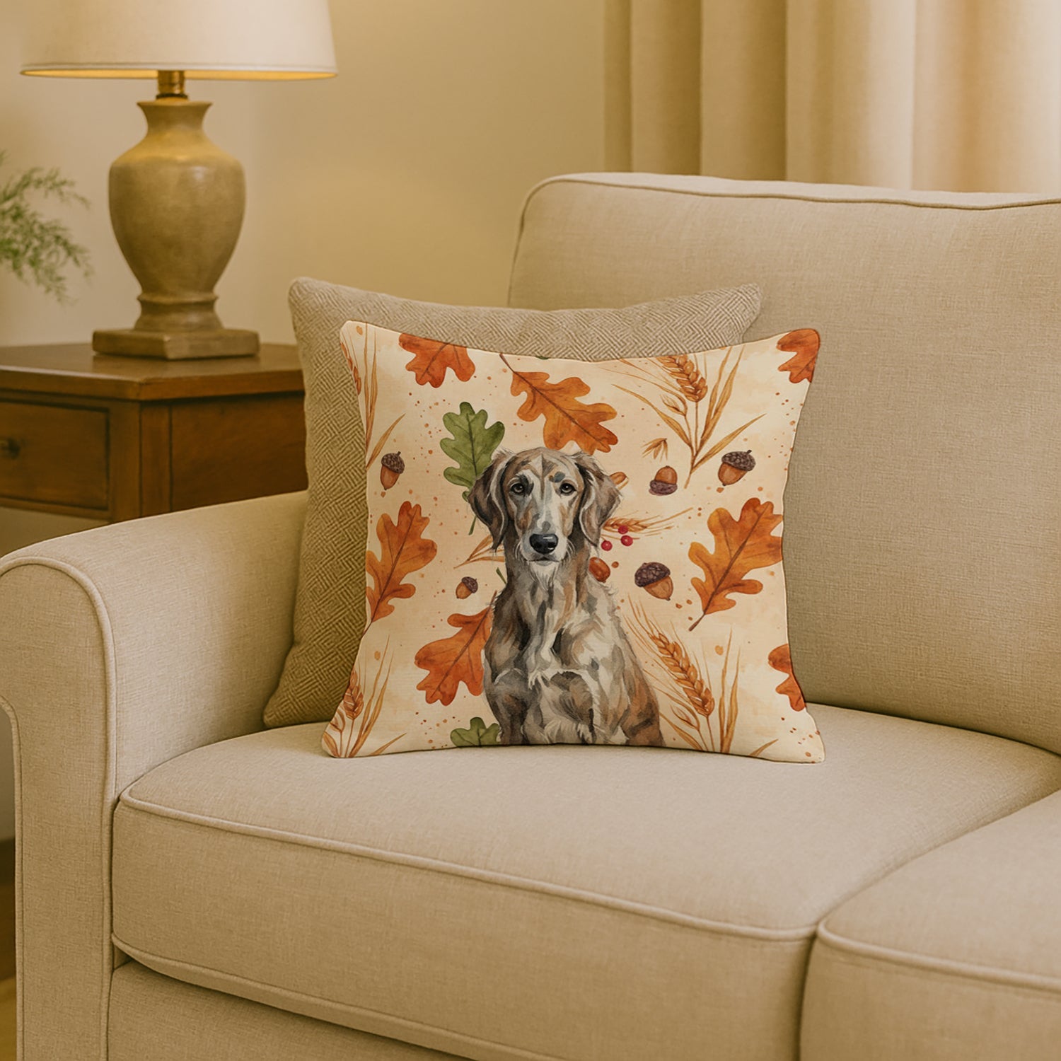 Throw Pillow featuring breed specific Scottish Deerhound artwork. Celebrate Thanksgiving with this Thanksgiving Pillow. Revitalize your outdoor or indoor living space with Caroline's Treasures 18x18 Fabric Decorative Pillow. With a generously sized dimension of approximately 18 inches by 18 inches, this pillow makes a comfortable and aesthetic addition to any seating area. Made from a unique, water-resistant material developed by Caroline's Treasures, the pillow sham is 100% polyester fabric that's durable and ready to weather any condition. Its vibrant, full-color artwork will not fade over time as it is dyed with color-fast dyes. Whether you place it on your patio furniture, porch, veranda, or indoor couch, its soft canvas fabric ensures a cozy experience. The pillow is handcrafted in the United States, featuring a sham created from three pieces of fabric and a polyester insert for enduring shape and overstuffed comfort. Despite being robustly built to endure the outdoors, it is as soft and snug as your favorite indoor cushions. Please note, as all our pillows are handmade, sizes may vary slightly, adding to the charm of this unique decorative item.