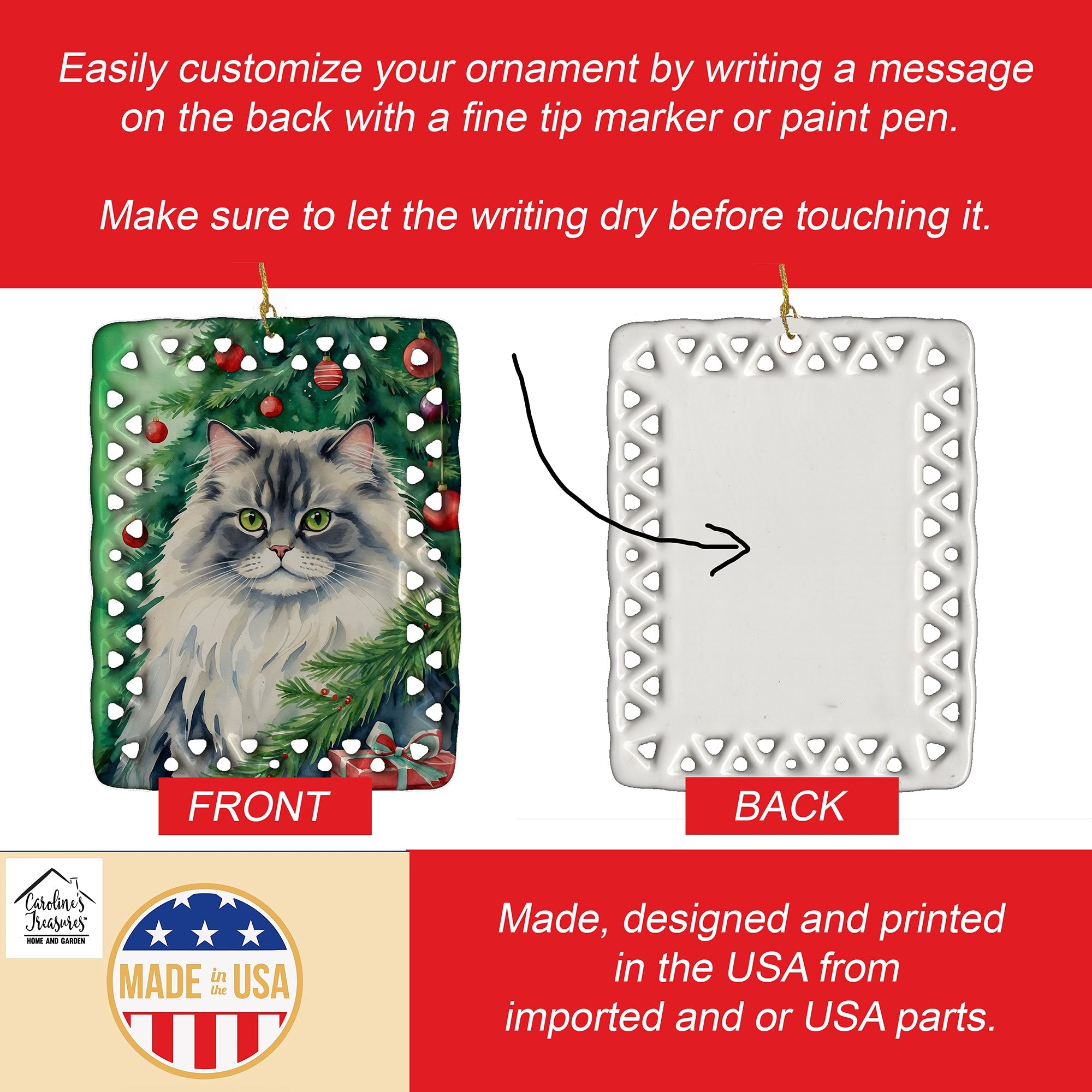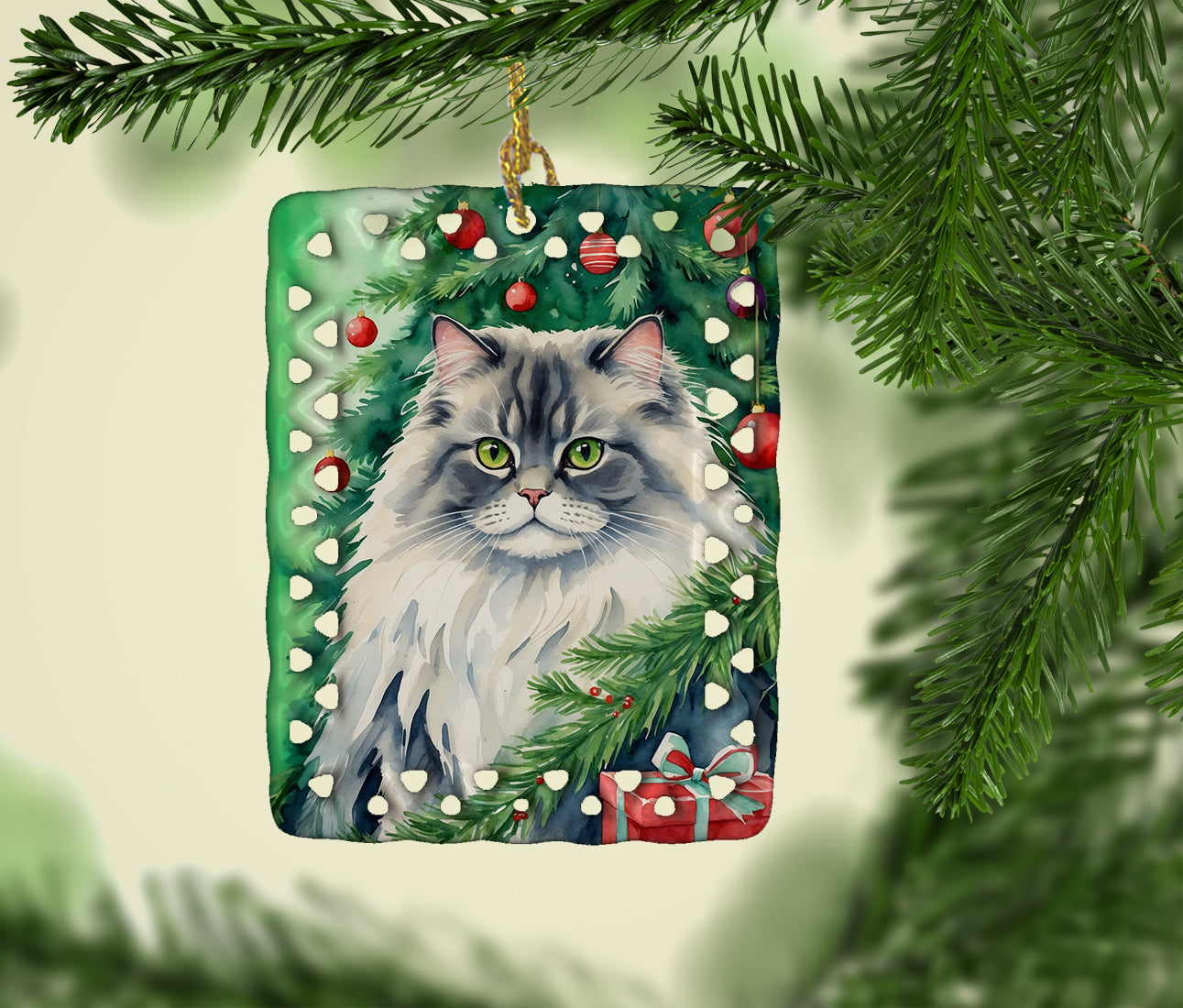 Porcelain Ornament featuring breed specific British Longhair artwork. Celebrate Christmas with this Christmas Ornament. Add a unique, personal touch to your holiday decor with our Rectangular Lattice Porcelain Ornament. Perfect for creating cherished memories, this high-quality ornament shines under festive lights, reflecting warmth and joy throughout your Christmas tree. Crafted with a glossy finish, it showcases vibrant, full-color artwork contributed by our talented artists, ensuring your tree is adorned with a burst of color and holiday spirit. What sets this Porcelain Ornament apart is its customizable white back. Use a paint pen or permanent marker to write a heartfelt message, commemorate a special year, or mark an unforgettable date, turning this ornament into a keepsake that will be treasured for years to come. For best results, allow any personalization to dry thoroughly before handling. Each ornament comes complete with a delicate gold cord, making it easy to hang and display. Proudly made in the USA, this ornament measures 3.375 x 2.625 inches and is a thoughtful gift for pet sitters, teachers, family members, or anyone who would appreciate a little extra holiday magic. Bring style, charm, and a touch of personal meaning to your Christmas tree with this beautifully designed ornament..