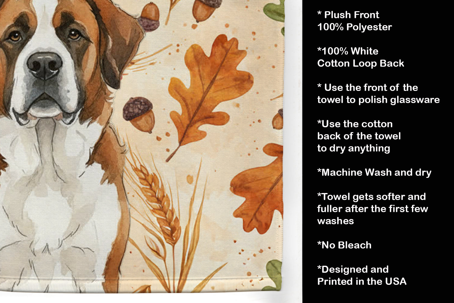 Kitchen Towel featuring breed specific Saint Bernard artwork. Celebrate Thanksgiving with this Thanksgiving Kitchen Towel. Bring cozy fall charm to your sink or powder room with a plush velour towel featuring original watercolor artwork. The front is a soft, color-rich minky polyester that polishes glassware to a brilliant shine; the back is 100% white cotton terry loop for quick absorbency on hands, dishes, and counters. Artwork is dyed into the fibers for lasting color that won’t crack or peel. Finished edges keep the shape wash after wash. Size: 15" x 25". Machine wash; tumble dry low. Designed and printed in the USA.