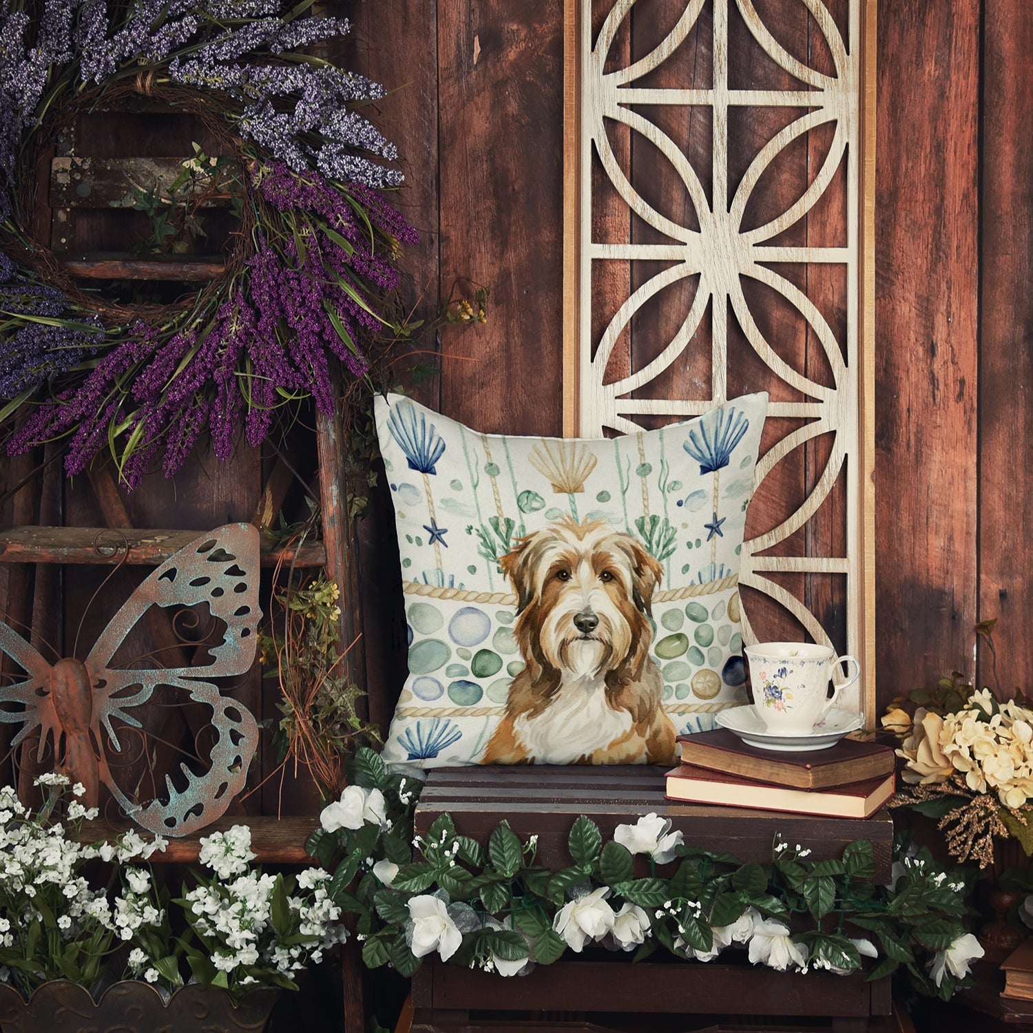 Brown Bearded Collie Coastal Sea Glass Throw Pillow
