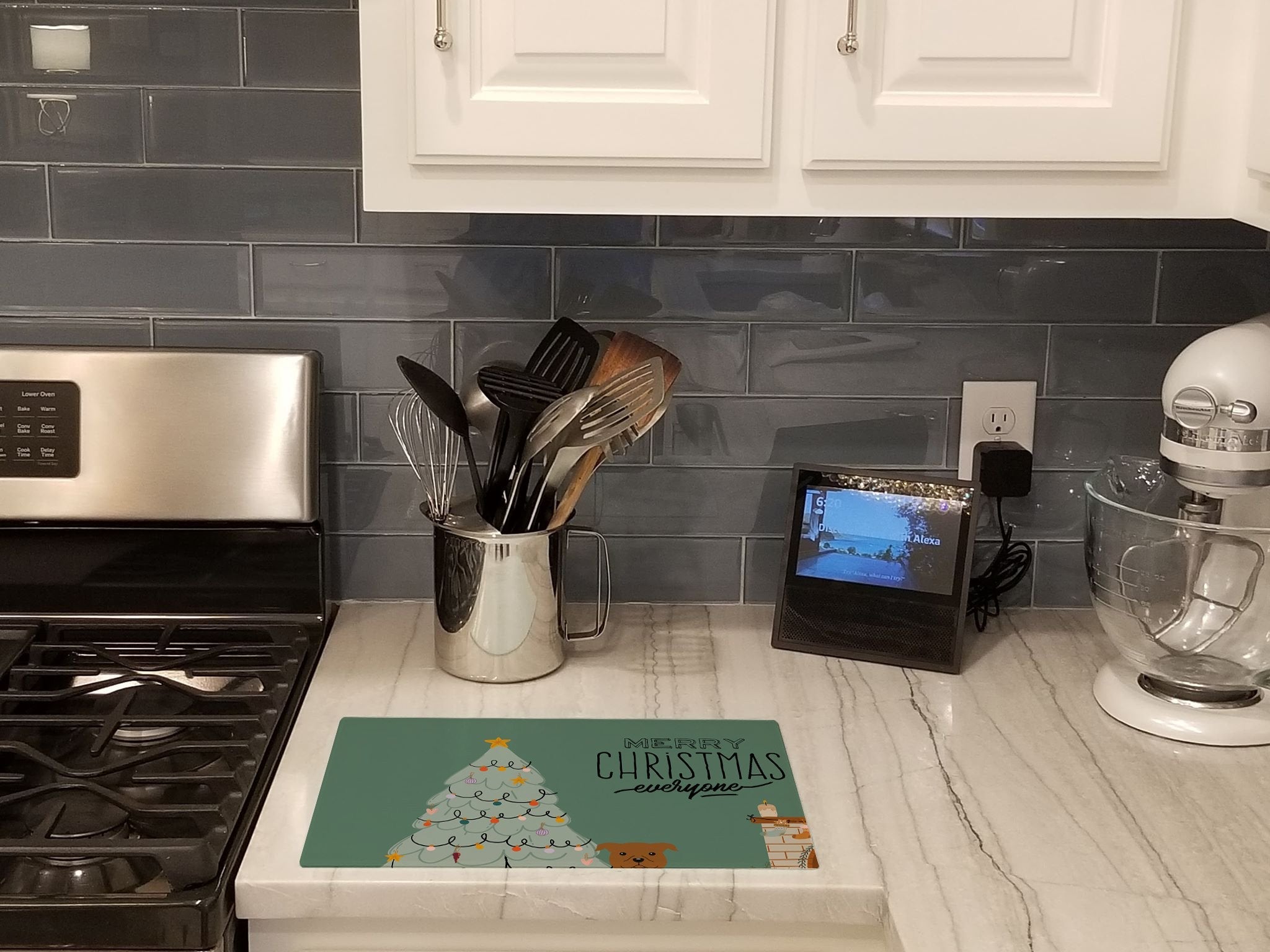 Decorate your space with our Christmas Staffordshire Bull Terrier artwork on a Cutting Board. Introduce your kitchen to the vibrant, large Decorative Glass Cutting Board from Caroline's Treasures. Crafted from resilient tempered glass, this board is not only a utilitarian necessity but also a colorful art piece. With its generous dimensions of 15 inches in height and 12 inches in length, it offers ample space for all your cutting needs. Every piece showcases captivating artwork from distinguished artists, bringing an aesthetic edge to your kitchen. Beyond its attractive design, this cutting board ensures your countertop stays pristine and unscathed, owing to its heat-resistant properties. Engineered with user convenience in mind, it features non-skid feet for stability, and rounded corners for additional safety. Its robust construction renders it virtually unbreakable, guaranteeing longevity. The board comes with protective feet bumpers, maintaining its position during use. This product is recommended to be hand washed only. Proudly printed and assembled in the United States, this cutting board exemplifies superior craftsmanship. With Caroline's Treasures' Decorative Glass Cutting Board, you're investing in a blend of functionality and artistic flair.