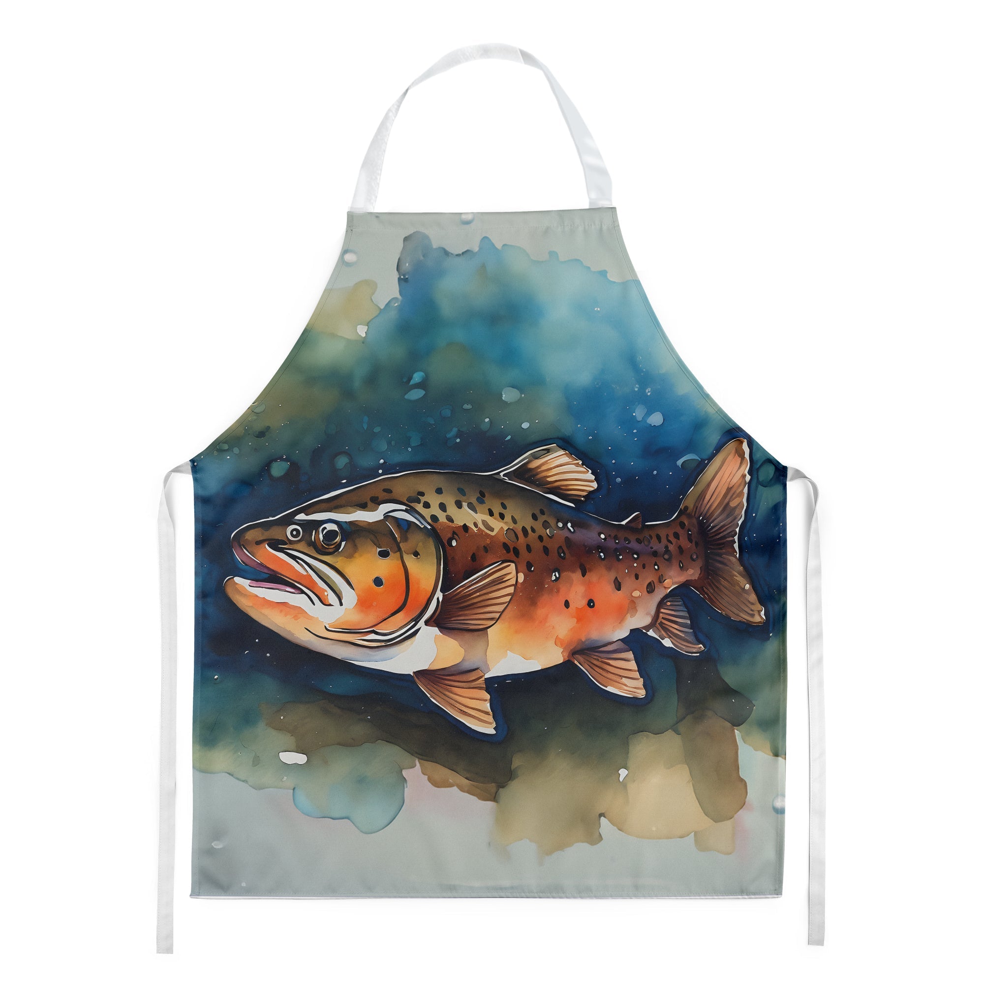 Decorate your space with our Brown Trout artwork on a Apron. Elevate your cooking, baking, and grilling experiences with our versatile Kitchen or BBQ Apron. This Bib Style apron isn't just limited to culinary activities - it also serves as an excellent baking apron, artist apron, server apron, gardening apron, or even a dog grooming apron. The apron showcases vibrant full-color artwork contributed by one of our talented artists, bringing a dash of style to your daily tasks. With dimensions of approximately 27"W x 30"H, it provides ample coverage to protect your clothing from spills and splashes. Our apron is meticulously crafted from 100% Ultra Spun Polyester, known for its durability and lightweight nature. The apron comes with white tie straps, ensuring a comfortable and adjustable fit for all. It's a perfect choice for kitchen apron enthusiasts, whether you are a woman or a man. Designed for easy maintenance, this apron is fully machine washable. The quick-drying polyester material actively reduces staining, keeping your apron looking fresh and new for longer. Our beautifully designed apron isn't just a functional kitchen accessory - it's a fashion statement in the culinary world!