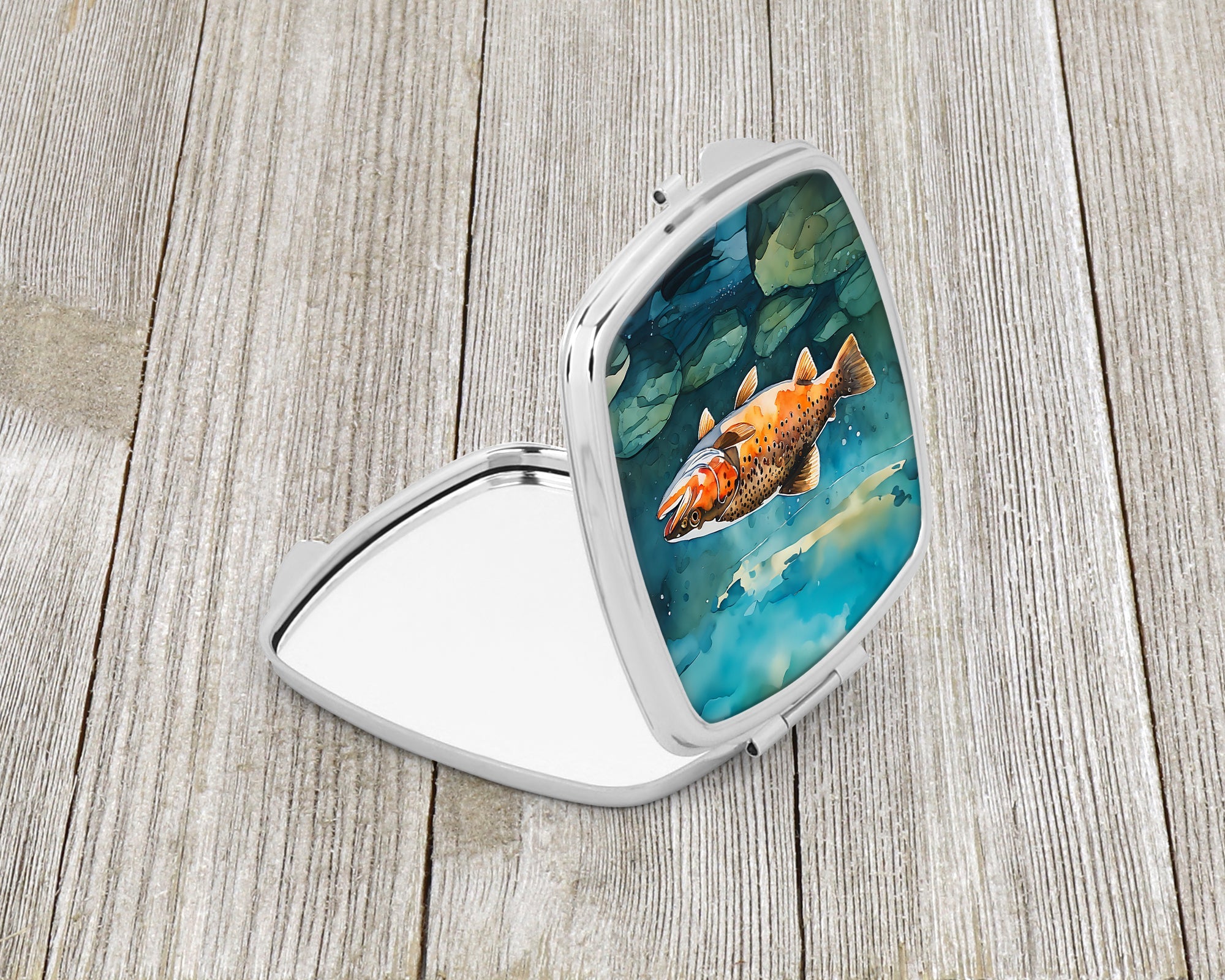 Decorate your space with our Brown Trout artwork on a Compact Mirror. Introducing our Square Compact Mirror, a blend of elegance, functionality, and compactness, perfect for on-the-go touch-ups. This Silvertone metal mirror, with dimensions of 2.75 inches x 3 inches x .3 inches, fits effortlessly into your purse, handbag, or pocket, ensuring that you can check your appearance anytime, anywhere. Our compact mirror stands out with its eye-catching artwork on the front, adding a dash of style to this practical accessory. It is more than just a mirror; it's a statement piece that reflects your personality and aesthetic. When opened, this compact reveals two mirrors inside, doubling your perspective for precise touch-ups. The Silvertone metal construction ensures durability while maintaining a lightweight feel, making it an ideal everyday carry item. Whether you're rushing to a meeting, prepping for a dinner date, or just need a quick check on your look, our Square Compact Mirror is your reliable companion. Experience the perfect blend of style and practicality with this must-have accessory.