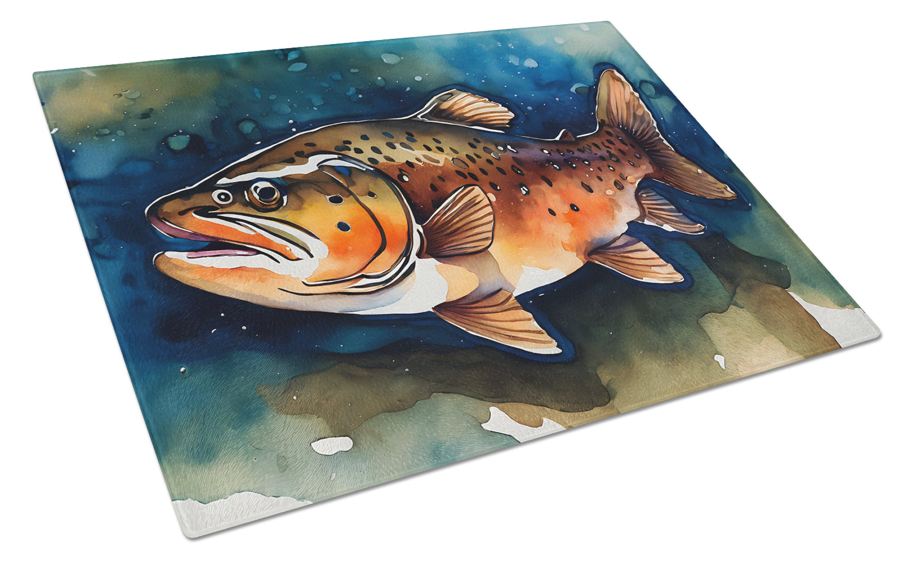 Decorate your space with our Brown Trout artwork on a Cutting Board. Introduce your kitchen to the vibrant, large Decorative Glass Cutting Board from Caroline's Treasures. Crafted from resilient tempered glass, this board is not only a utilitarian necessity but also a colorful art piece. With its generous dimensions of 15 inches in height and 12 inches in length, it offers ample space for all your cutting needs. Every piece showcases captivating artwork from distinguished artists, bringing an aesthetic edge to your kitchen. Beyond its attractive design, this cutting board ensures your countertop stays pristine and unscathed, owing to its heat-resistant properties. Engineered with user convenience in mind, it features non-skid feet for stability, and rounded corners for additional safety. Its robust construction renders it virtually unbreakable, guaranteeing longevity. The board comes with protective feet bumpers, maintaining its position during use. This product is recommended to be hand washed only. Proudly printed and assembled in the United States, this cutting board exemplifies superior craftsmanship. With Caroline's Treasures' Decorative Glass Cutting Board, you're investing in a blend of functionality and artistic flair.