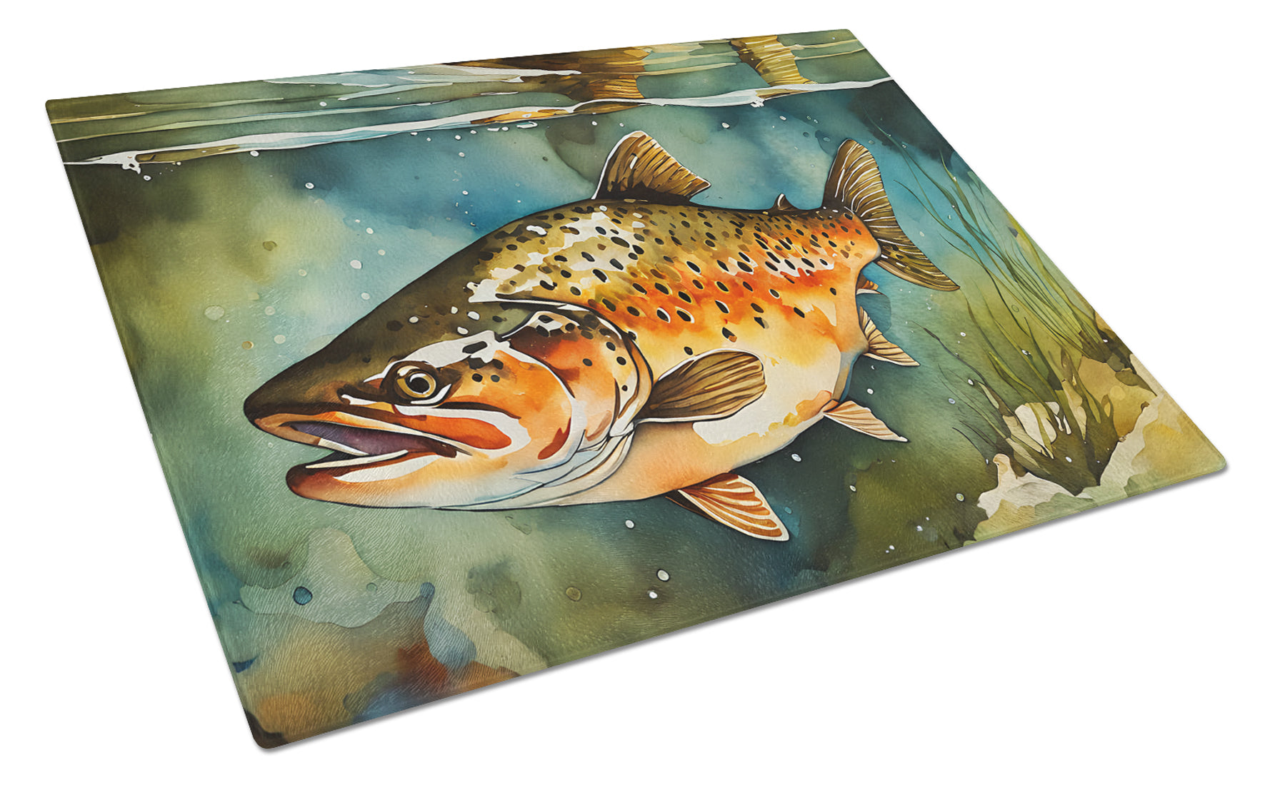 Decorate your space with our Brown Trout artwork on a Cutting Board. Introduce your kitchen to the vibrant, large Decorative Glass Cutting Board from Caroline's Treasures. Crafted from resilient tempered glass, this board is not only a utilitarian necessity but also a colorful art piece. With its generous dimensions of 15 inches in height and 12 inches in length, it offers ample space for all your cutting needs. Every piece showcases captivating artwork from distinguished artists, bringing an aesthetic edge to your kitchen. Beyond its attractive design, this cutting board ensures your countertop stays pristine and unscathed, owing to its heat-resistant properties. Engineered with user convenience in mind, it features non-skid feet for stability, and rounded corners for additional safety. Its robust construction renders it virtually unbreakable, guaranteeing longevity. The board comes with protective feet bumpers, maintaining its position during use. This product is recommended to be hand washed only. Proudly printed and assembled in the United States, this cutting board exemplifies superior craftsmanship. With Caroline's Treasures' Decorative Glass Cutting Board, you're investing in a blend of functionality and artistic flair.