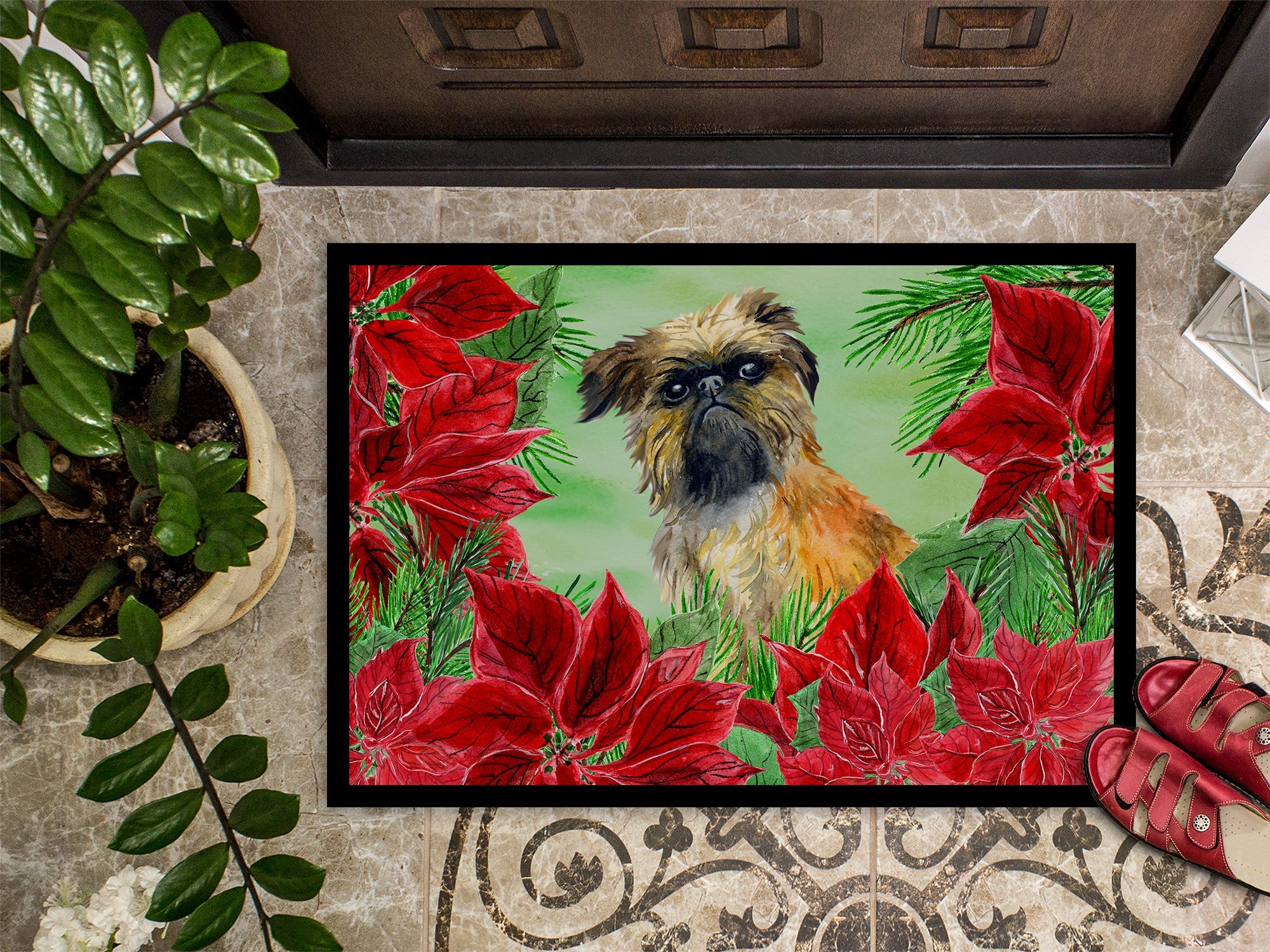 Decorate your space with our Brussels Griffon artwork on a Doormat. Welcome your guests in style with our Artwork Door Mat, designed to withstand almost any weather condition. This mat, measuring approximately 18 by 27 inches, is held together by durable black binding tape. Its top layer, composed of polyester felt, is dyed with the eye-catching image you see on the mat. A few layers below provide the mat with stability, while its rubber bottom is stamped to help prevent slipping and ensures safety. Our mat works wonderfully as both an indoor or outdoor door mat. For cleaning, simply hose it off with water or use a power washer - no need for any cleaner that produces suds. Avoid scrubbing with a brush, instead, opt for the vacuum on floor setting. Designed manufactured and printed in the USA, this mat is a perfect addition to your porch, outdoor kitchen, entryway, or any indoor space. Its unique design makes it a charming decorative rug that greets your guests and adds a stylish touch to your home decor.