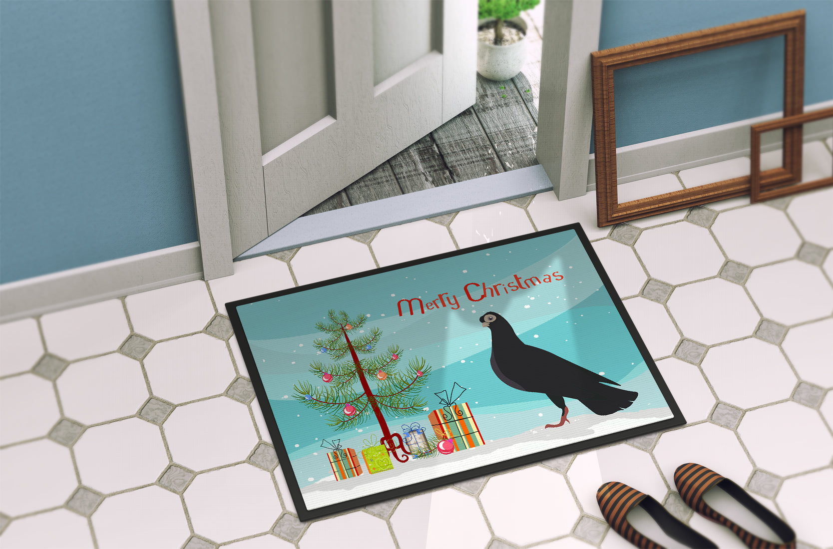 Decorate your space with our Christmas Budapest Highflyer Pigeon artwork on a Doormat. Welcome your guests in style with our Artwork Door Mat, designed to withstand almost any weather condition. This mat, measuring approximately 24 by 36 inches, is held together by durable black binding tape. Its top layer, composed of polyester felt, is dyed with the eye-catching image you see on the mat. A few layers below provide the mat with stability, while its rubber bottom is stamped to help prevent slipping and ensures safety. Our mat works wonderfully as both an indoor or outdoor door mat. For cleaning, simply hose it off with water or use a power washer - no need for any cleaner that produces suds. Avoid scrubbing with a brush, instead, opt for the vacuum on floor setting. Designed manufactured and printed in the USA, this mat is a perfect addition to your porch, outdoor kitchen, entryway, or any indoor space. Its unique design makes it a charming decorative rug that greets your guests and adds a stylish touch to your home decor.