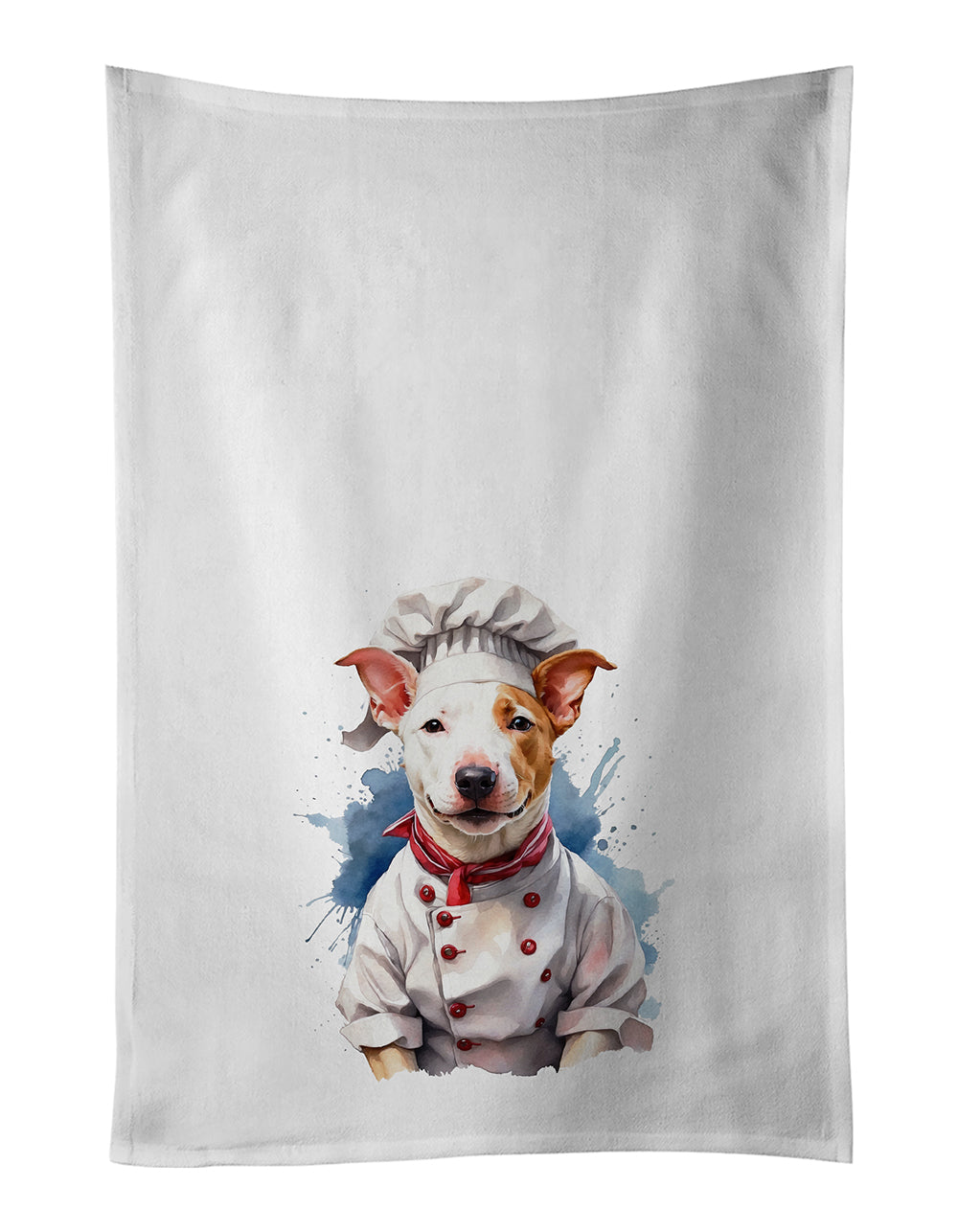 Kitchen Towel Set of 2 featuring breed specific Bull Terrier artwork. Spruce up your kitchen decor with Caroline's Treasures Decorative White Kitchen Towel Set. This set of two dish towels showcases beautiful artwork from one of our talented artists, making them both practical and visually appealing. These towels are crafted from 100% cotton, offering excellent absorbency and durability, making them ideal for any kitchen task. Each white towel measures 19 inches by 28 inches, providing ample coverage for drying dishes or wiping up spills. The standout feature of these towels is the full-color artwork design printed on each one. They can serve as a vibrant accent in your kitchen, turning a functional item into a delightful piece of decor. When it comes to care, these towels are machine washable in cold water and can be dried on low heat. Remember to always use a pressing cloth when pressing the design, and avoid using bleach on the decorated towel. The Decorative White Kitchen Towel Set makes a great gift or a stylish addition to your own kitchen.