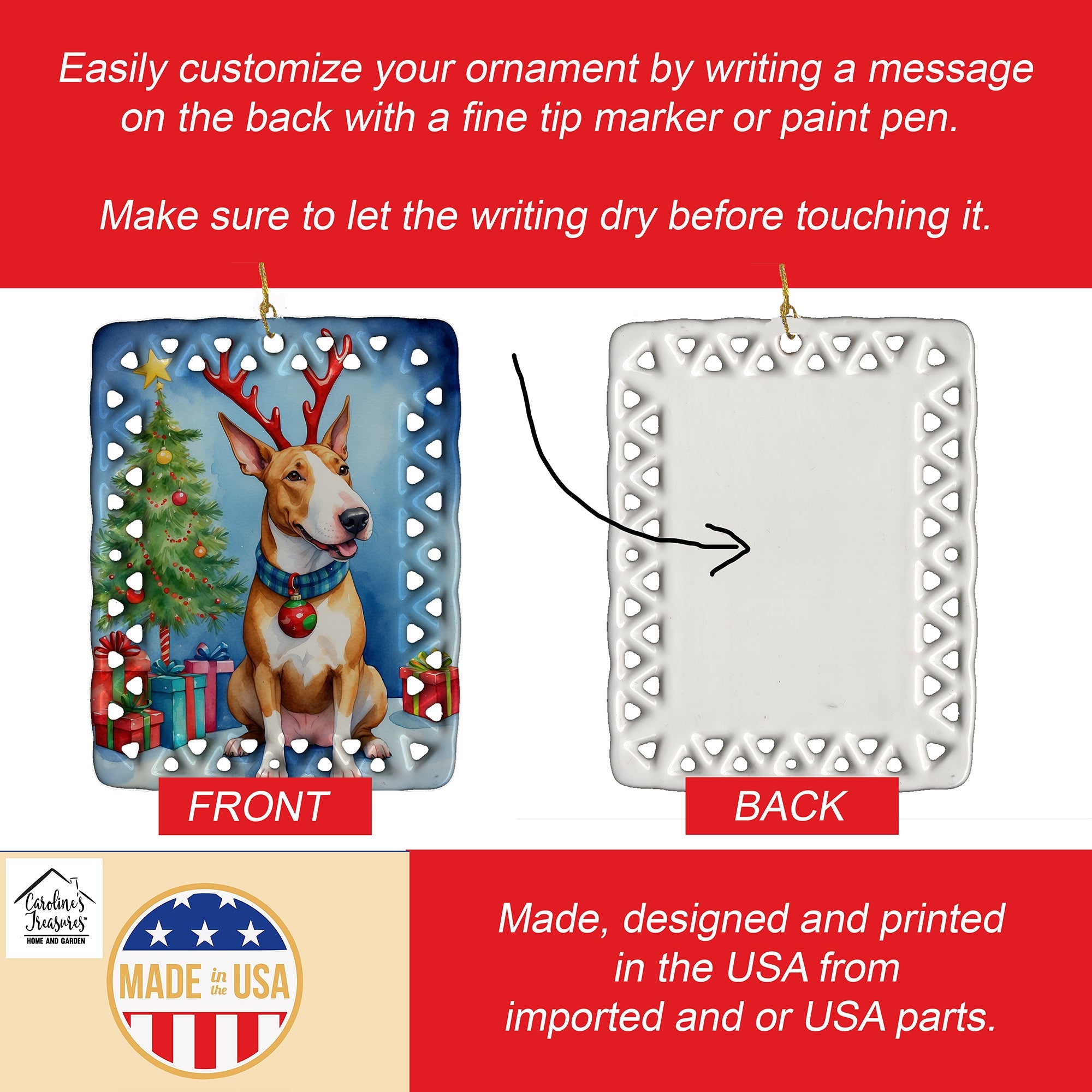 Porcelain Ornament featuring breed specific Bull Terrier artwork. Celebrate Christmas with this Christmas Ornament. Add a unique, personal touch to your holiday decor with our Rectangular Lattice Porcelain Ornament. Perfect for creating cherished memories, this high-quality ornament shines under festive lights, reflecting warmth and joy throughout your Christmas tree. Crafted with a glossy finish, it showcases vibrant, full-color artwork contributed by our talented artists, ensuring your tree is adorned with a burst of color and holiday spirit. What sets this Porcelain Ornament apart is its customizable white back. Use a paint pen or permanent marker to write a heartfelt message, commemorate a special year, or mark an unforgettable date, turning this ornament into a keepsake that will be treasured for years to come. For best results, allow any personalization to dry thoroughly before handling. Each ornament comes complete with a delicate gold cord, making it easy to hang and display. Proudly made in the USA, this ornament measures 3.375 x 2.625 inches and is a thoughtful gift for pet sitters, teachers, family members, or anyone who would appreciate a little extra holiday magic. Bring style, charm, and a touch of personal meaning to your Christmas tree with this beautifully designed ornament..