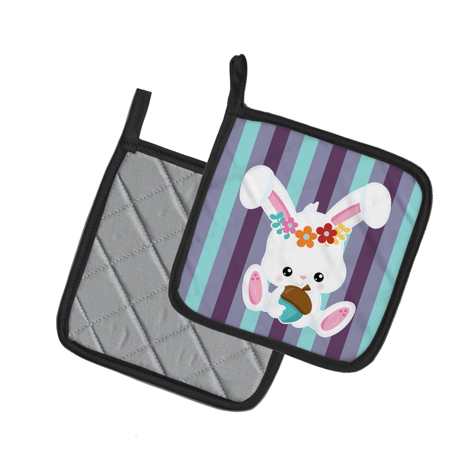Decorate your space with our Rabbit artwork on a Pair of Pot Holders. A Pair of Pot Holders to match your kitchen decor. Made in the USA these are thick and functional. Full color artwork decorates the front polyester fabric of the hot pad and accented by a black trim. Use these at as a trivet for your Thanksgiving or Christmas tablescape. Filled with insulated fabric and quilted for durability. These colorful pot holders will make a great gift for your favorite home cook or executive chef. Each pot holder measures approximately 7 1/2 inches by 7 1/2 inches. A hanging tab is included.