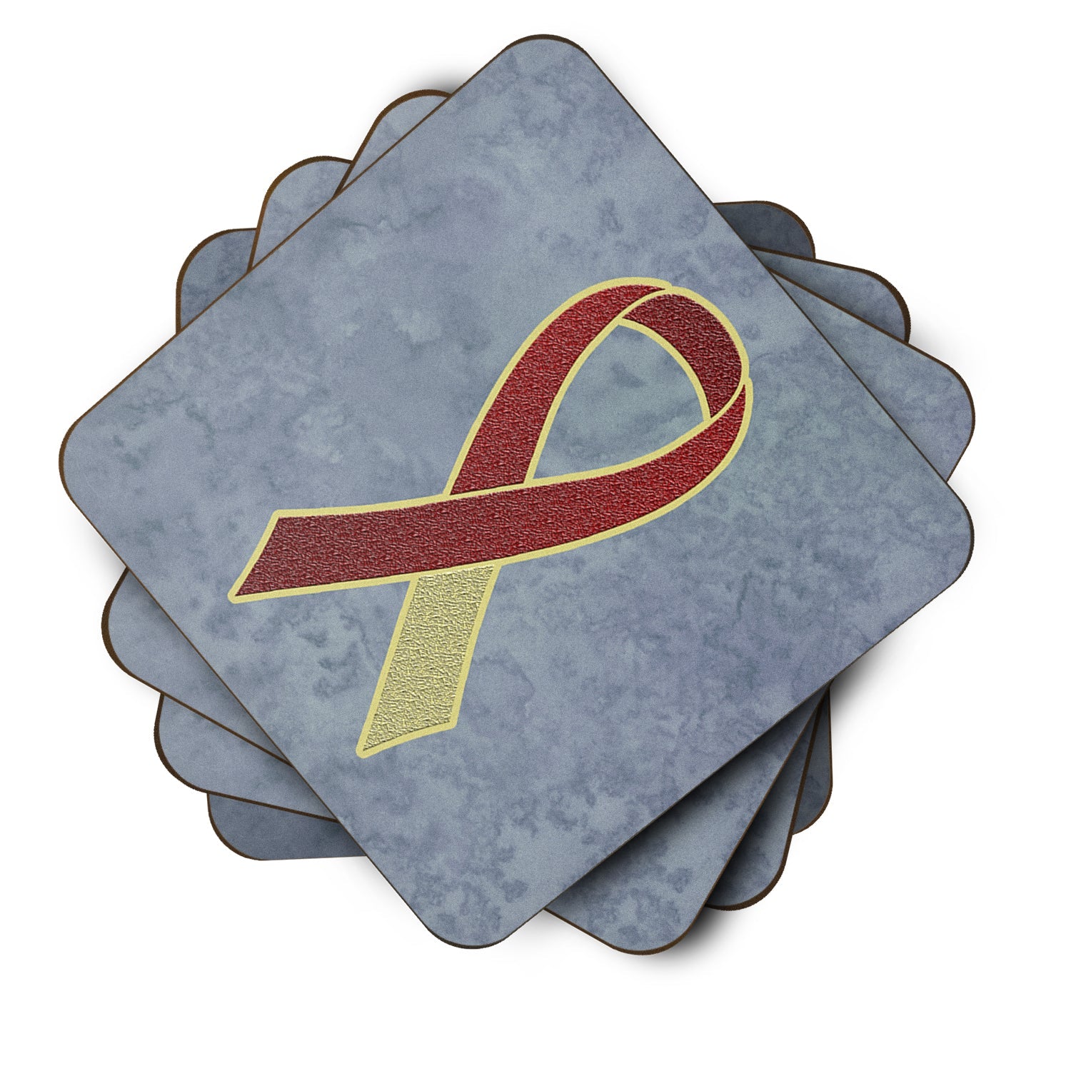 Decorate your space with our Burgundy and Ivory Ribbon for Head and Neck Cancer artwork on a Coaster set. Presenting our Set of 4 Foam Coasters, a stylish and practical addition to your table setting. Each square coaster, measuring 3 1/2 inches by 3 1/2 inches, is perfectly sized to accommodate various drinkware, from coffee mugs to tumblers. These coasters stand out with their full-color artwork, permanently dyed onto the material for a vibrant and fade-resistant finish. They're not just functional, they're a fashionable statement, adding a touch of flair to any gathering or event. Our foam coasters serve a dual purpose - they protect your table from water stains and are perfect for both hot and cold drinks. The material used is similar to that of our high-quality mouse pads, ensuring durability and heat resistance. These coasters are easy to maintain - simply wash them in the top of your dishwasher and lay flat to dry. The design won't come off, ensuring they retain their vivid colors for years. Pair them with one of our insulated coolers or huggers for a cohesive, thoughtful gift set. Enhance your beverage experience with our Set of 4 Foam Coasters.