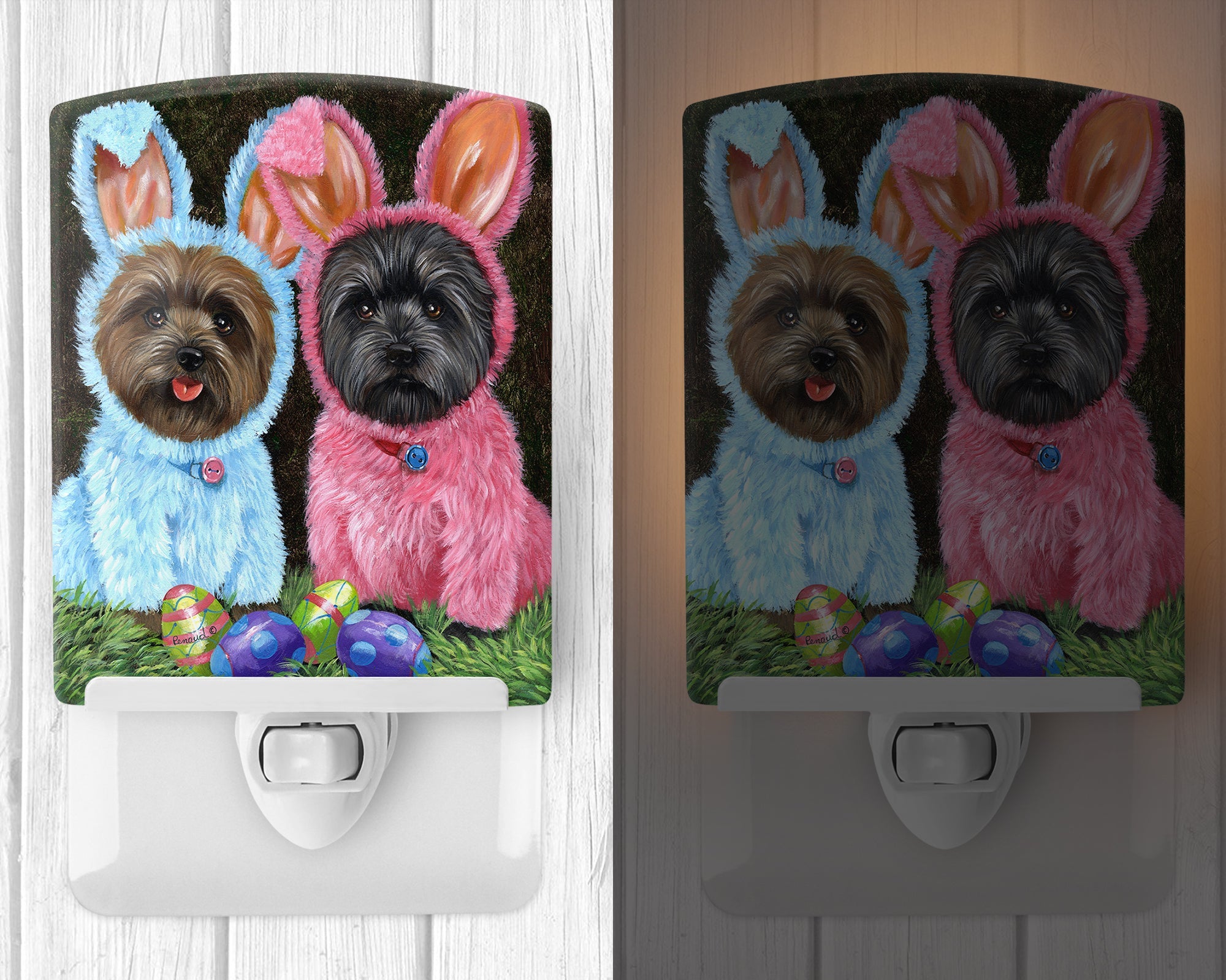 Decorate your space with our Easter Cairn Terrier artwork on a Night Light. Introduce a splash of artistic flair and subtle illumination to your space with the Decorative Ceramic Night Light from Caroline's Treasures. Perfect for any room, this night light seamlessly blends functionality with an aesthetic appeal, offering a stylish solution to brighten up dark corners of your home or office. Boasting a six-inch high by four-inch wide ceramic tile at the front, it showcases vivid, full-color artwork from distinguished artists, transforming a simple utility into a vibrant art piece. The artwork is securely encased in a robust metal holder, ensuring durability and longevity. Two screws are provided to firmly affix the tile into the holder. The holder extends three inches deep, housing an included bulb that emits a soft, welcoming glow. This product meets all safety standards, as evidenced by its UL approval. Proudly made in the United States from imported components, this Decorative Ceramic Night Light is not just a functional device; it's a statement piece that enhances the ambiance of your surroundings.