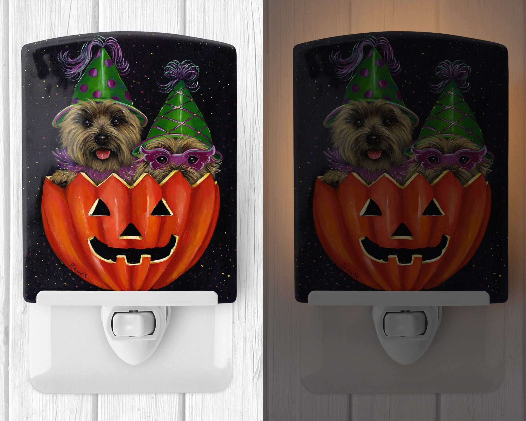 Decorate your space with our Halloween Cairn Terrier artwork on a Night Light. Introduce a splash of artistic flair and subtle illumination to your space with the Decorative Ceramic Night Light from Caroline's Treasures. Perfect for any room, this night light seamlessly blends functionality with an aesthetic appeal, offering a stylish solution to brighten up dark corners of your home or office. Boasting a six-inch high by four-inch wide ceramic tile at the front, it showcases vivid, full-color artwork from distinguished artists, transforming a simple utility into a vibrant art piece. The artwork is securely encased in a robust metal holder, ensuring durability and longevity. Two screws are provided to firmly affix the tile into the holder. The holder extends three inches deep, housing an included bulb that emits a soft, welcoming glow. This product meets all safety standards, as evidenced by its UL approval. Proudly made in the United States from imported components, this Decorative Ceramic Night Light is not just a functional device; it's a statement piece that enhances the ambiance of your surroundings.