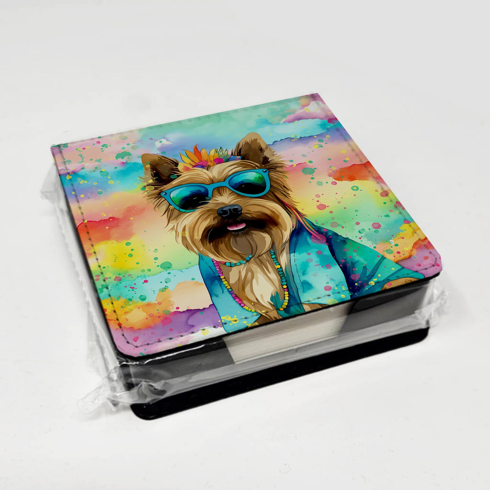 PU Leather Note Paper Holder featuring breed specific Cairn Terrier artwork. Elevate your workspace with this PU Leather Note Paper Holder, crafted to resemble luxurious leather without the use of animal products. Made from durable synthetic PU leather, it offers both a premium look and eco-friendly appeal. This note holder, compactly sized at 4.25 x 4.25 x 1.25 inches, includes about 160 sheets of 3.75 x 3.75-inch note paper—ideal for quick notes and reminders. An exclusive artist-designed cover makes each holder uniquely vibrant, adding a splash of color and personality to any desk or office. The discrete design keeps note paper hidden, maintaining a neat and organized workspace. Perfect as a gift or for personal use, this stylish holder is refillable with standard paper, ensuring long-lasting utility. A must-have for anyone seeking a sophisticated, artful touch to their workspace while supporting animal-friendly products. Add style, organization, and creativity to your everyday routine with this elegant note paper holder.