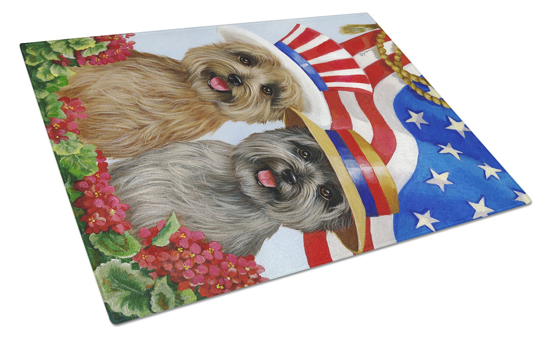 Decorate your space with our Cairn Terrier artwork on a Cutting Board. Introduce your kitchen to the vibrant, large Decorative Glass Cutting Board from Caroline's Treasures. Crafted from resilient tempered glass, this board is not only a utilitarian necessity but also a colorful art piece. With its generous dimensions of 15 inches in height and 12 inches in length, it offers ample space for all your cutting needs. Every piece showcases captivating artwork from distinguished artists, bringing an aesthetic edge to your kitchen. Beyond its attractive design, this cutting board ensures your countertop stays pristine and unscathed, owing to its heat-resistant properties. Engineered with user convenience in mind, it features non-skid feet for stability, and rounded corners for additional safety. Its robust construction renders it virtually unbreakable, guaranteeing longevity. The board comes with protective feet bumpers, maintaining its position during use. This product is recommended to be hand washed only. Proudly printed and assembled in the United States, this cutting board exemplifies superior craftsmanship. With Caroline's Treasures' Decorative Glass Cutting Board, you're investing in a blend of functionality and artistic flair.