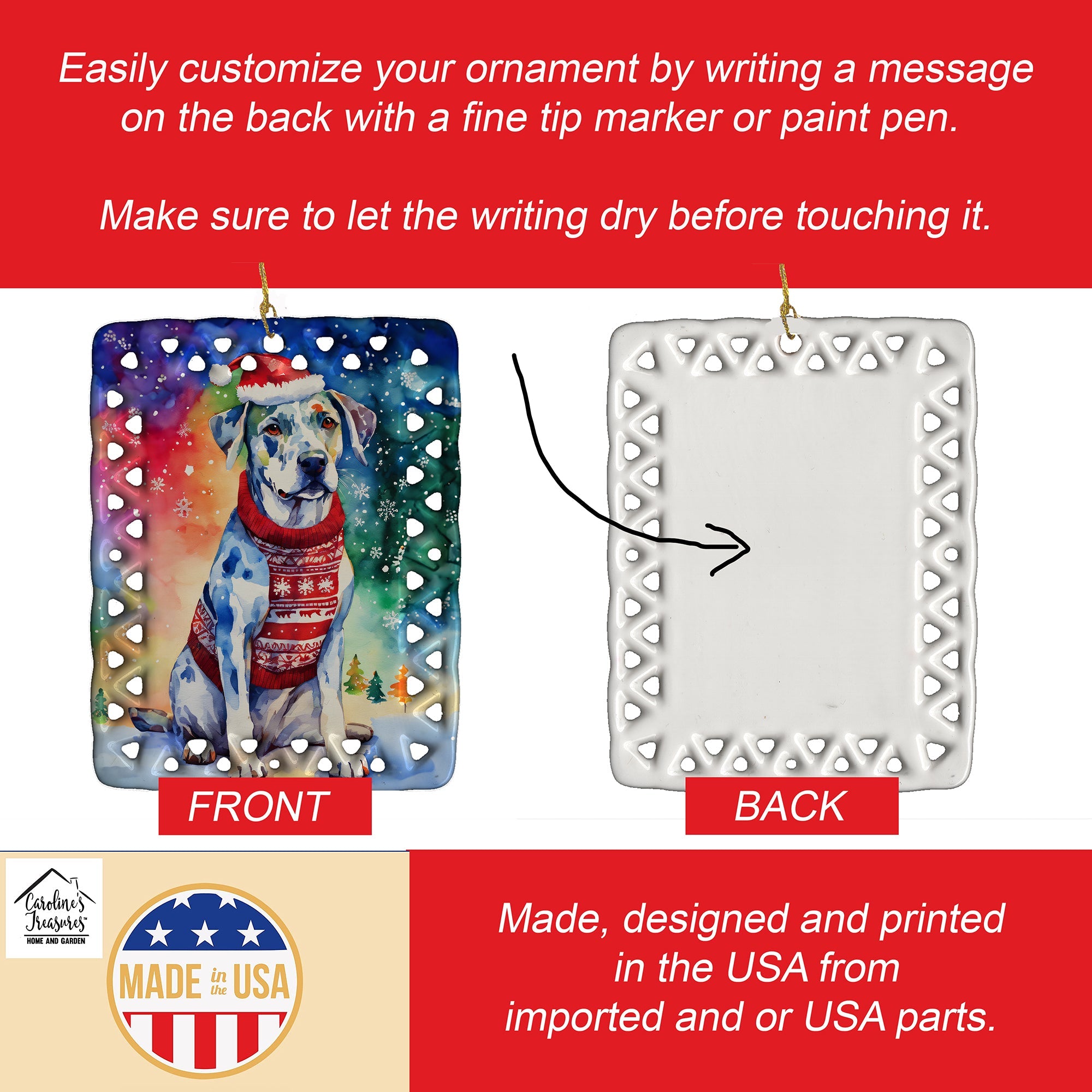 Porcelain Ornament featuring breed specific Catahoula artwork. Celebrate Christmas with this Christmas Ornament. Add a unique, personal touch to your holiday decor with our Rectangular Lattice Porcelain Ornament. Perfect for creating cherished memories, this high-quality ornament shines under festive lights, reflecting warmth and joy throughout your Christmas tree. Crafted with a glossy finish, it showcases vibrant, full-color artwork contributed by our talented artists, ensuring your tree is adorned with a burst of color and holiday spirit. What sets this Porcelain Ornament apart is its customizable white back. Use a paint pen or permanent marker to write a heartfelt message, commemorate a special year, or mark an unforgettable date, turning this ornament into a keepsake that will be treasured for years to come. For best results, allow any personalization to dry thoroughly before handling. Each ornament comes complete with a delicate gold cord, making it easy to hang and display. Proudly made in the USA, this ornament measures 3.375 x 2.625 inches and is a thoughtful gift for pet sitters, teachers, family members, or anyone who would appreciate a little extra holiday magic. Bring style, charm, and a touch of personal meaning to your Christmas tree with this beautifully designed ornament..