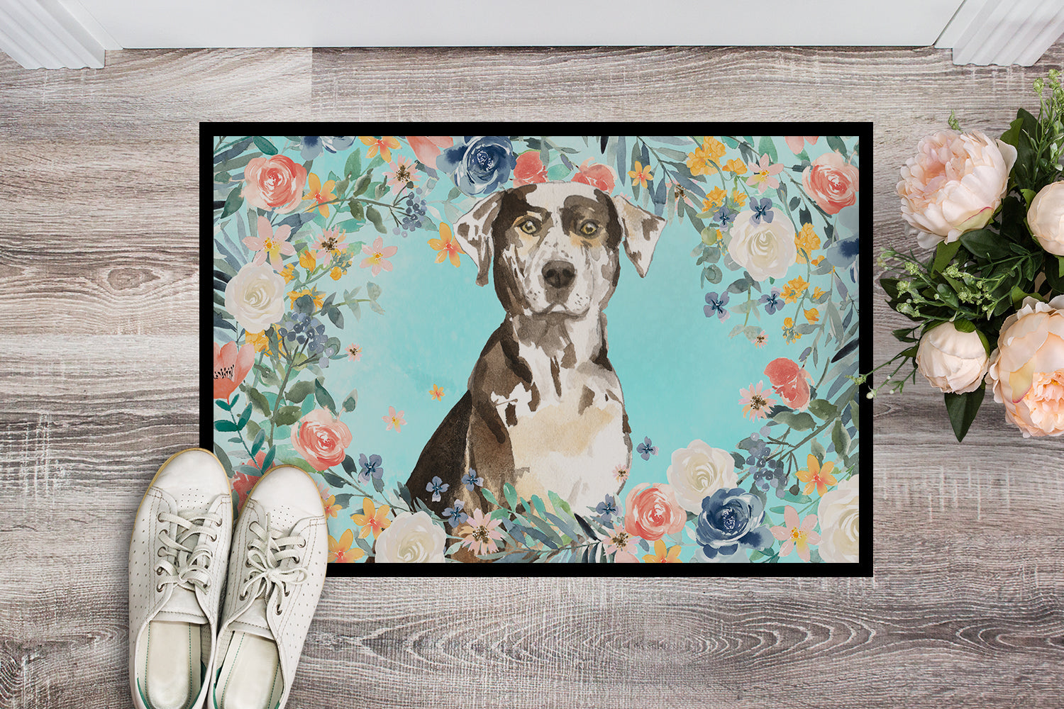 Decorate your space with our Catahoula Leopard Dog artwork on a Doormat. Welcome your guests in style with our Artwork Door Mat, designed to withstand almost any weather condition. This mat, measuring approximately 24 by 36 inches, is held together by durable black binding tape. Its top layer, composed of polyester felt, is dyed with the eye-catching image you see on the mat. A few layers below provide the mat with stability, while its rubber bottom is stamped to help prevent slipping and ensures safety. Our mat works wonderfully as both an indoor or outdoor door mat. For cleaning, simply hose it off with water or use a power washer - no need for any cleaner that produces suds. Avoid scrubbing with a brush, instead, opt for the vacuum on floor setting. Designed manufactured and printed in the USA, this mat is a perfect addition to your porch, outdoor kitchen, entryway, or any indoor space. Its unique design makes it a charming decorative rug that greets your guests and adds a stylish touch to your home decor.