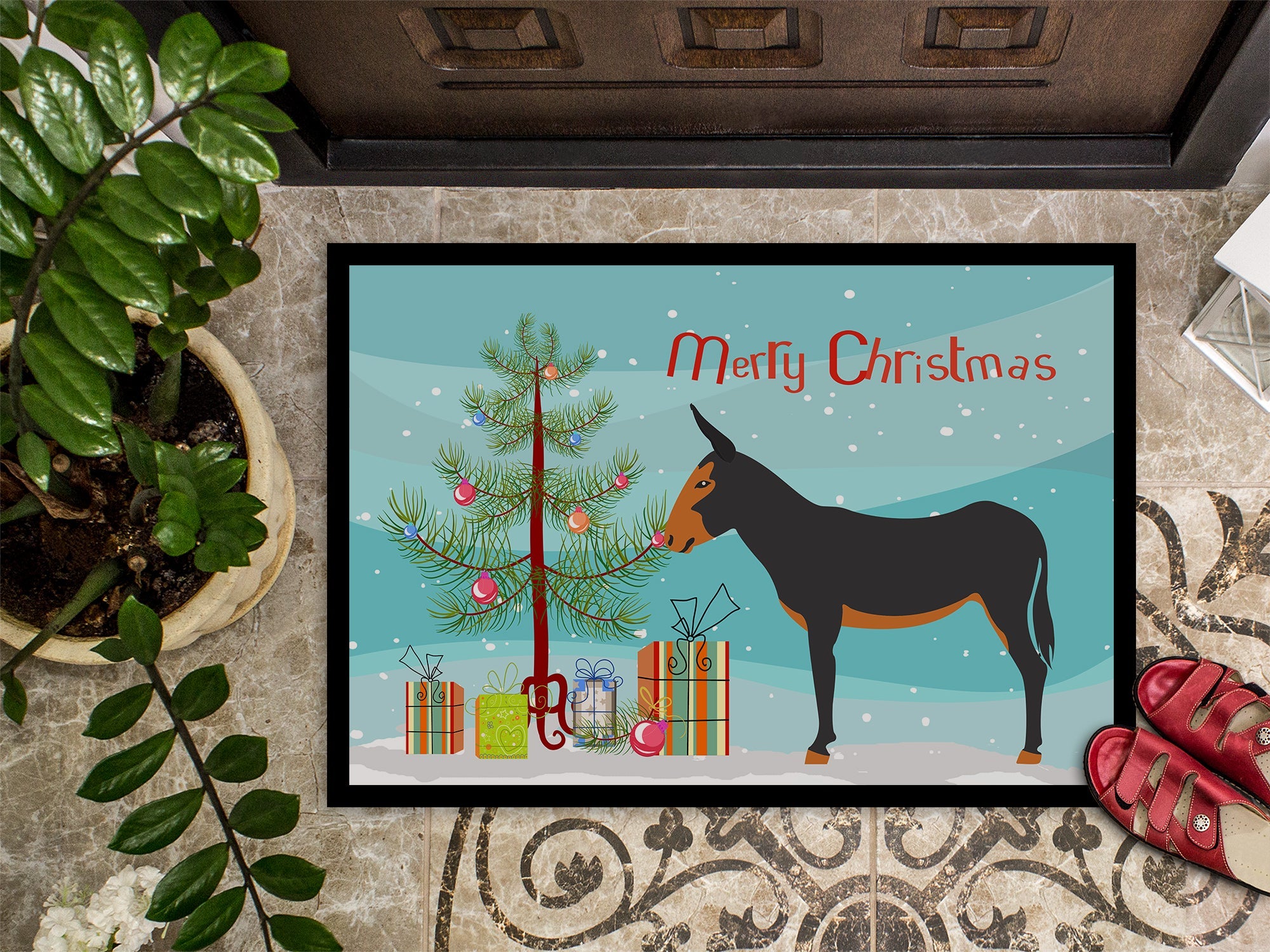 Decorate your space with our Christmas Catalan Donkey artwork on a Doormat. Welcome your guests in style with our Artwork Door Mat, designed to withstand almost any weather condition. This mat, measuring approximately 24 by 36 inches, is held together by durable black binding tape. Its top layer, composed of polyester felt, is dyed with the eye-catching image you see on the mat. A few layers below provide the mat with stability, while its rubber bottom is stamped to help prevent slipping and ensures safety. Our mat works wonderfully as both an indoor or outdoor door mat. For cleaning, simply hose it off with water or use a power washer - no need for any cleaner that produces suds. Avoid scrubbing with a brush, instead, opt for the vacuum on floor setting. Designed manufactured and printed in the USA, this mat is a perfect addition to your porch, outdoor kitchen, entryway, or any indoor space. Its unique design makes it a charming decorative rug that greets your guests and adds a stylish touch to your home decor.