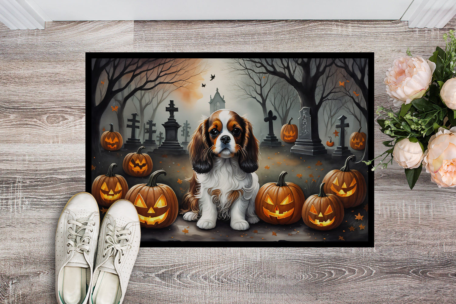 Decorate your space with our Halloween Cavalier Spaniel artwork on a Doormat. Welcome your guests in style with our Artwork Door Mat, designed to withstand almost any weather condition. This mat, measuring approximately 24 by 36 inches, is held together by durable black binding tape. Its top layer, composed of polyester felt, is dyed with the eye-catching image you see on the mat. A few layers below provide the mat with stability, while its rubber bottom is stamped to help prevent slipping and ensures safety. Our mat works wonderfully as both an indoor or outdoor door mat. For cleaning, simply hose it off with water or use a power washer - no need for any cleaner that produces suds. Avoid scrubbing with a brush, instead, opt for the vacuum on floor setting. Designed manufactured and printed in the USA, this mat is a perfect addition to your porch, outdoor kitchen, entryway, or any indoor space. Its unique design makes it a charming decorative rug that greets your guests and adds a stylish touch to your home decor.