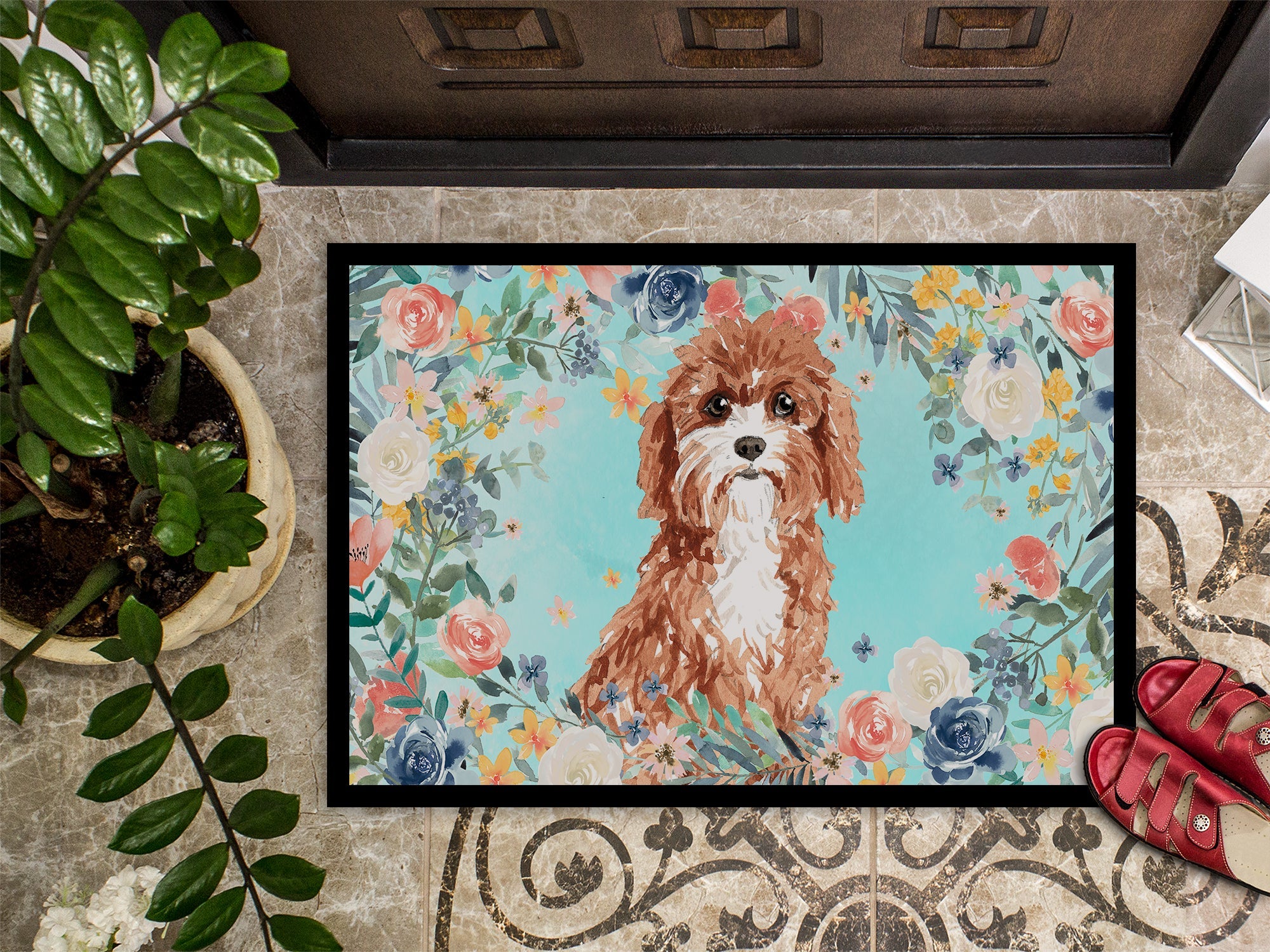 Decorate your space with our Cavapoo artwork on a Doormat. Welcome your guests in style with our Artwork Door Mat, designed to withstand almost any weather condition. This mat, measuring approximately 24 by 36 inches, is held together by durable black binding tape. Its top layer, composed of polyester felt, is dyed with the eye-catching image you see on the mat. A few layers below provide the mat with stability, while its rubber bottom is stamped to help prevent slipping and ensures safety. Our mat works wonderfully as both an indoor or outdoor door mat. For cleaning, simply hose it off with water or use a power washer - no need for any cleaner that produces suds. Avoid scrubbing with a brush, instead, opt for the vacuum on floor setting. Designed manufactured and printed in the USA, this mat is a perfect addition to your porch, outdoor kitchen, entryway, or any indoor space. Its unique design makes it a charming decorative rug that greets your guests and adds a stylish touch to your home decor.