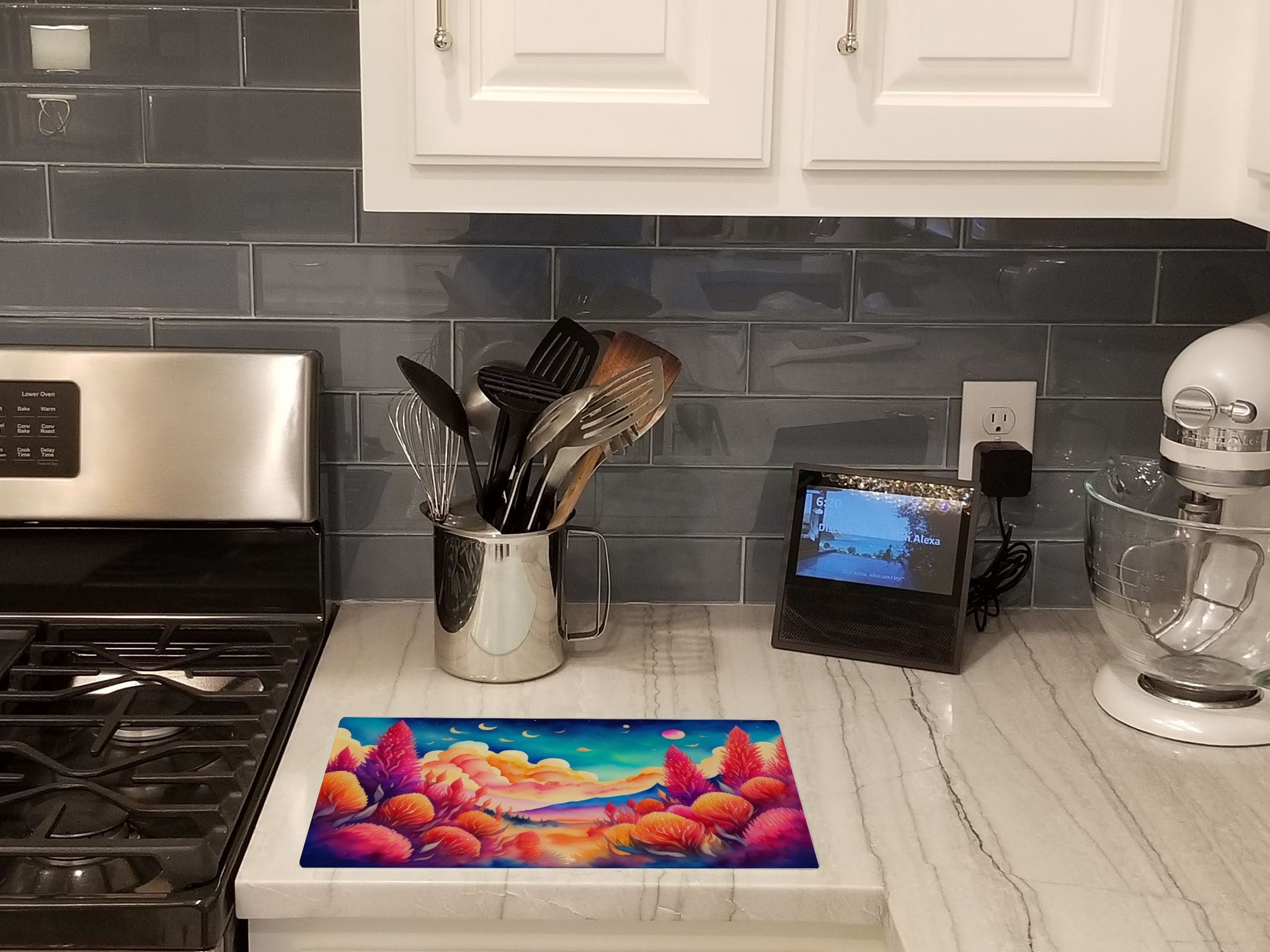 Introduce your kitchen to the vibrant, large Decorative Glass Cutting Board from Caroline's Treasures. Crafted from resilient tempered glass, this board is not only a utilitarian necessity but also a colorful art piece. With its generous dimensions of 15 inches in height and 12 inches in length, it offers ample space for all your cutting needs. Every piece showcases captivating artwork from distinguished artists, bringing an aesthetic edge to your kitchen. Beyond its attractive design, this cutting board ensures your countertop stays pristine and unscathed, owing to its heat-resistant properties. Engineered with user convenience in mind, it features non-skid feet for stability, and rounded corners for additional safety. Its robust construction renders it virtually unbreakable, guaranteeing longevity. The board comes with protective feet bumpers, maintaining its position during use. This product is recommended to be hand washed only. Proudly printed and assembled in the United States, this cutting board exemplifies superior craftsmanship. With Caroline's Treasures' Decorative Glass Cutting Board, you're investing in a blend of functionality and artistic flair.
